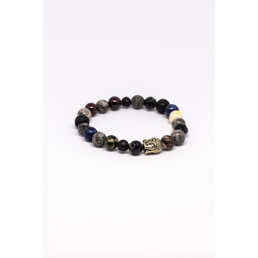 BUDDHA OF INDIVIDUALITY (Buddha osobitosti) tvoří: turmalín, mramor hladké a fasetované kuličky, černá perlička, křemen fasetovaná kulička, měsíční kámen, sodalit, granát, láva, ozdobný korálek Buddhy