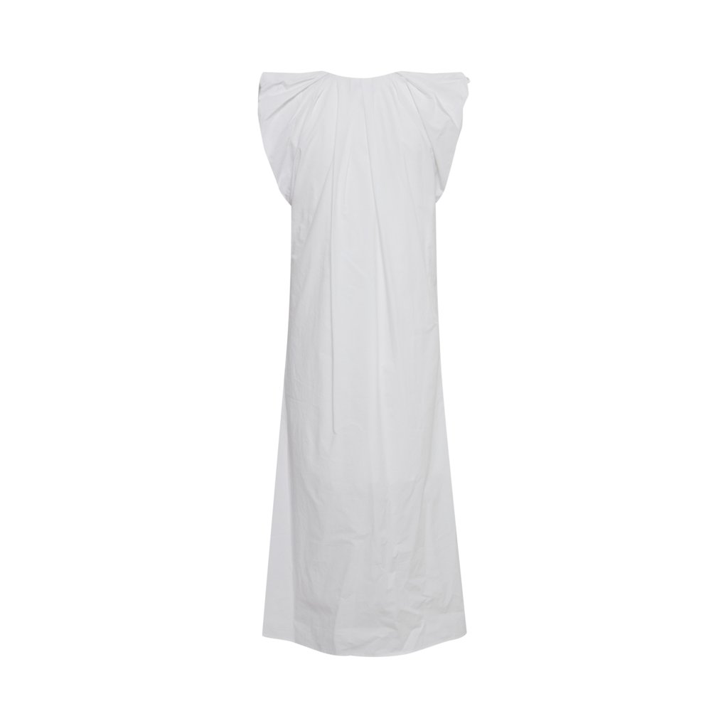 Bílé volné šaty s nařasenými rukávy a páskem.