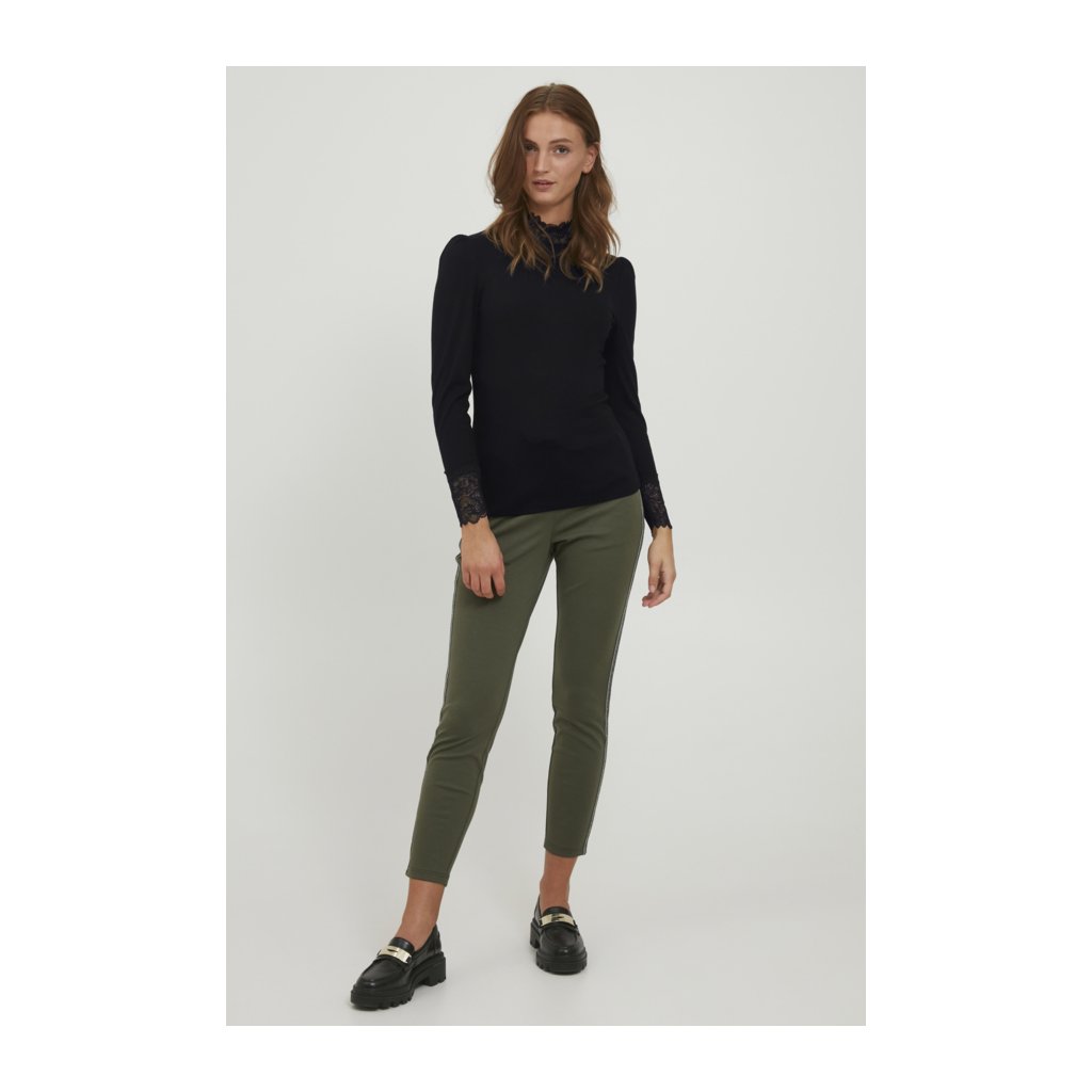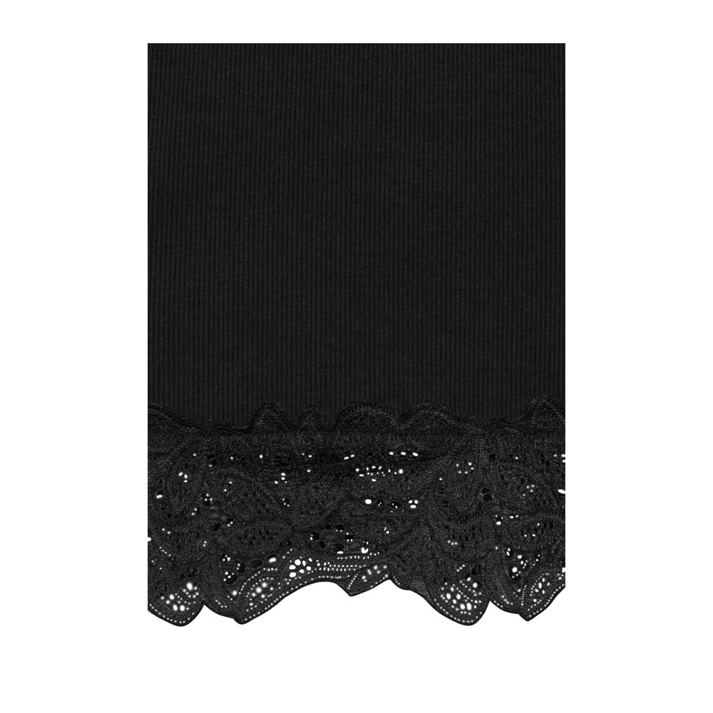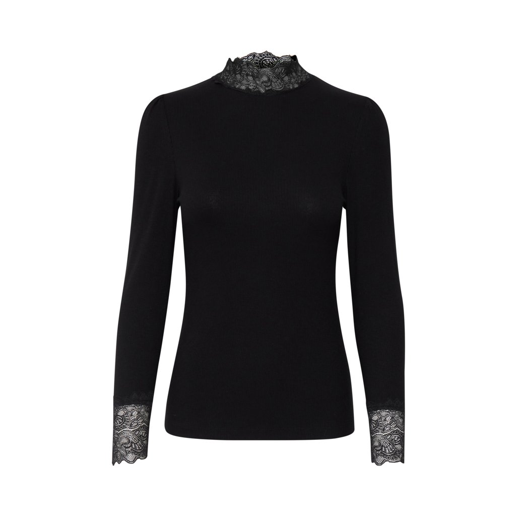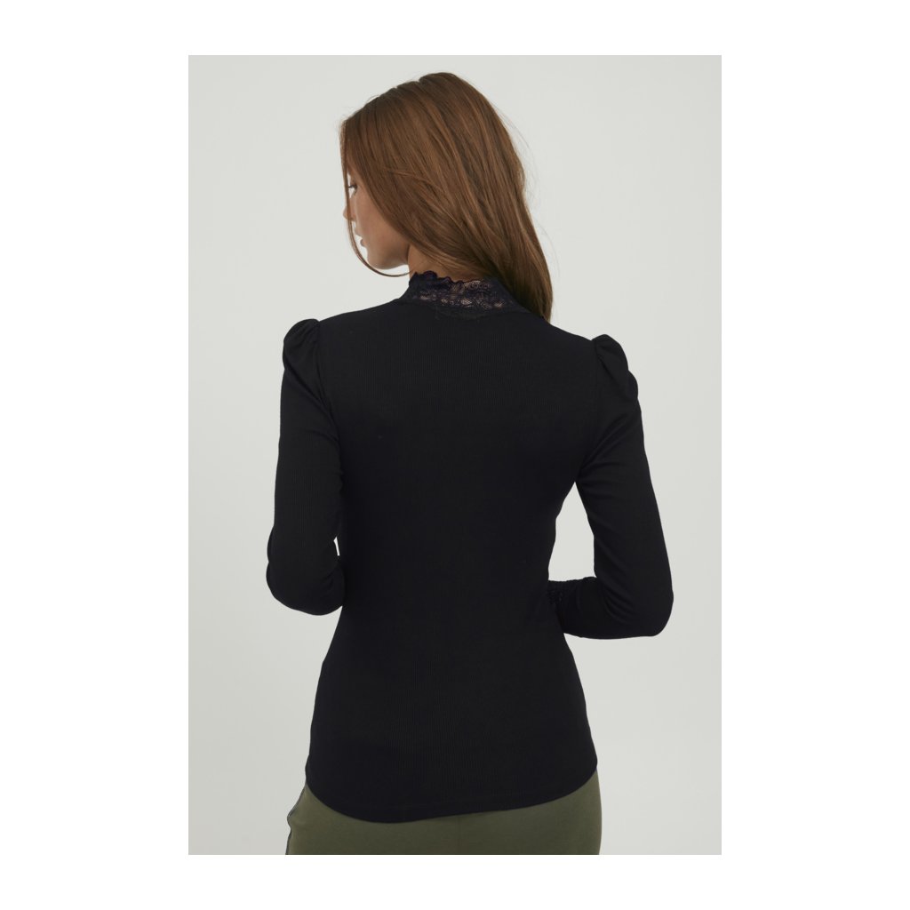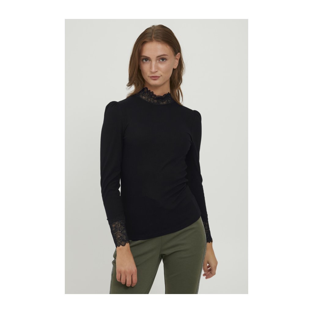 Černé tričko s dlouhým rukávem se žebrováním a krajkou. Jemně nabíraná ramena, límeček a rukávy zdobené krajkou.