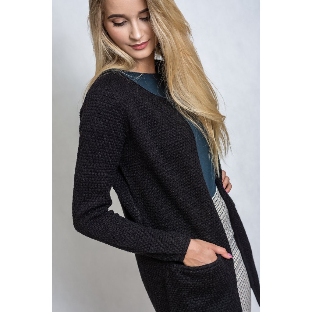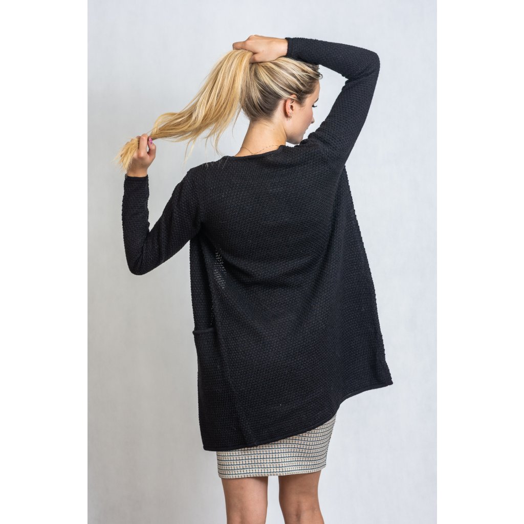 Dlouhý svetr v černé barvě s kapsami.