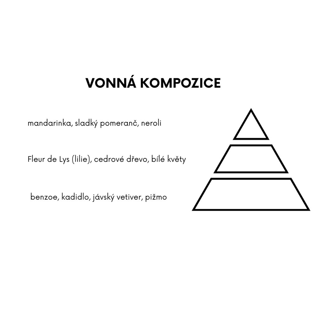 V úvodu ucítíte mandarinku, sladký pomeranč a neroli, které postupně přechází do Fleur de Lys (lilie), cedrového dřeva a bílých květů sturače. Celý zážitek uzemní hřejivý závěr se stopou benzoe, kadidla, jávský vetiver a pižmo.