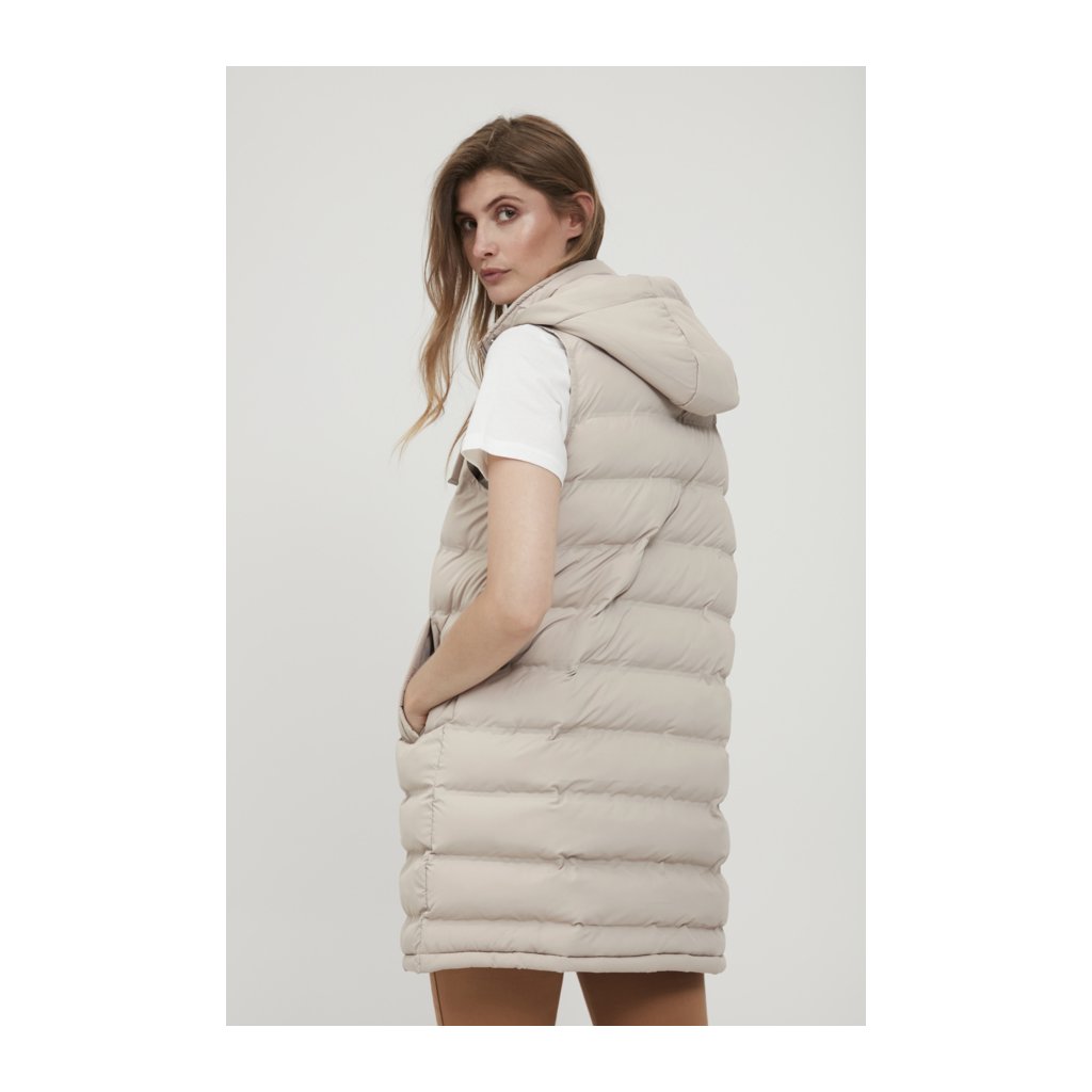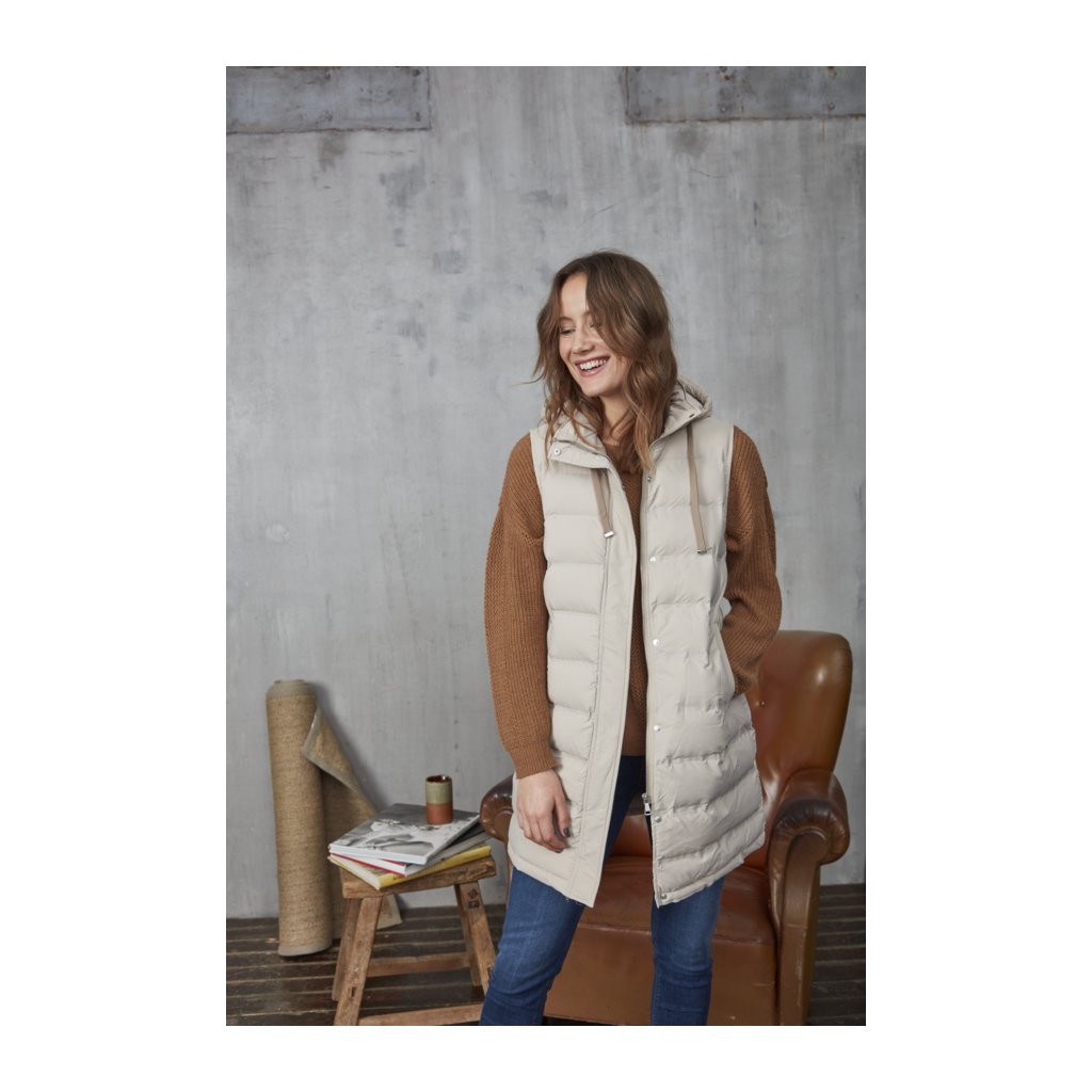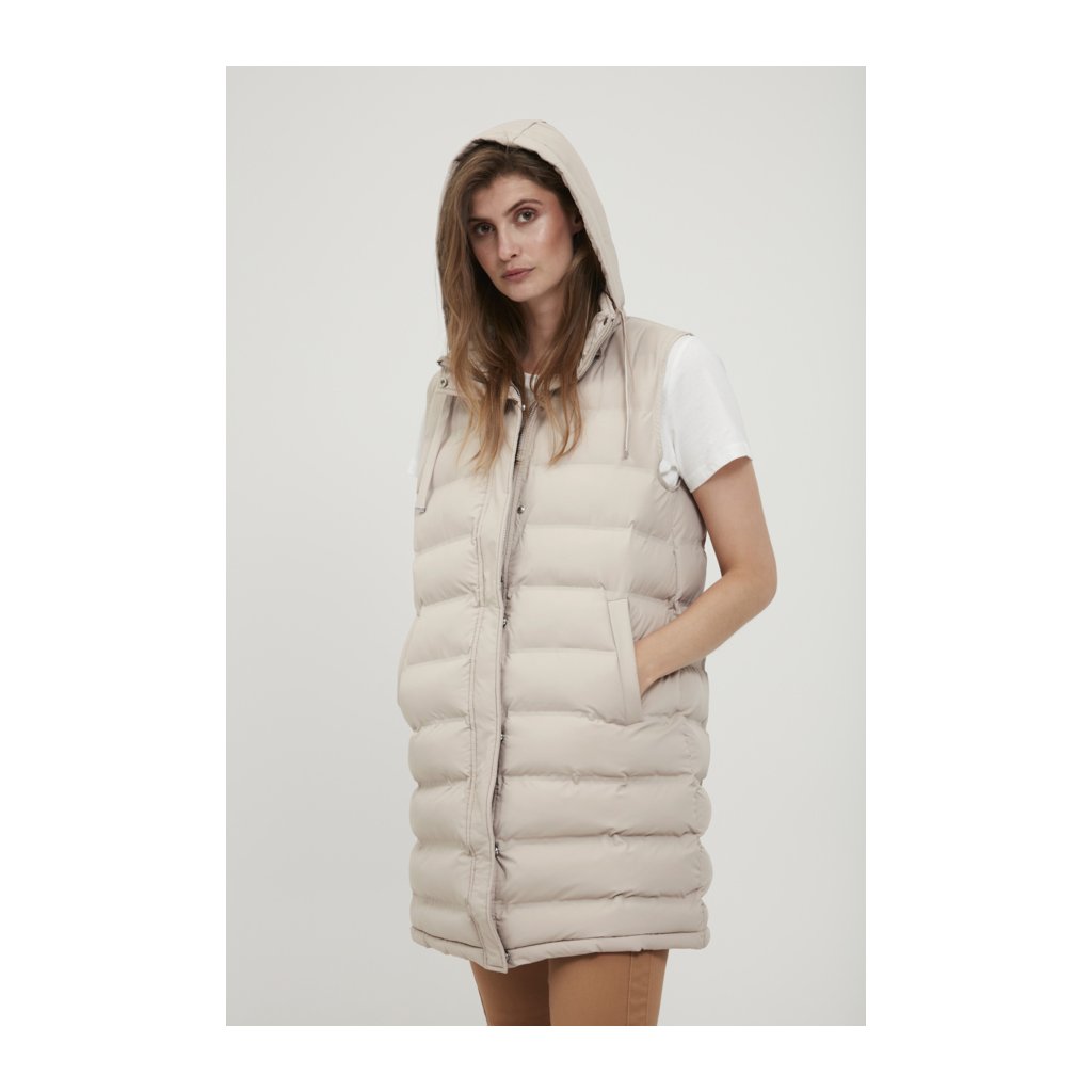Hřejivá vesta s kapucí a kapsami. Kapuci lze stáhnout pomocí šňůrek a odepnout pomocí zipu. Zapínání vesty na zip a cvoky.