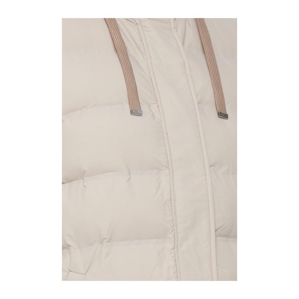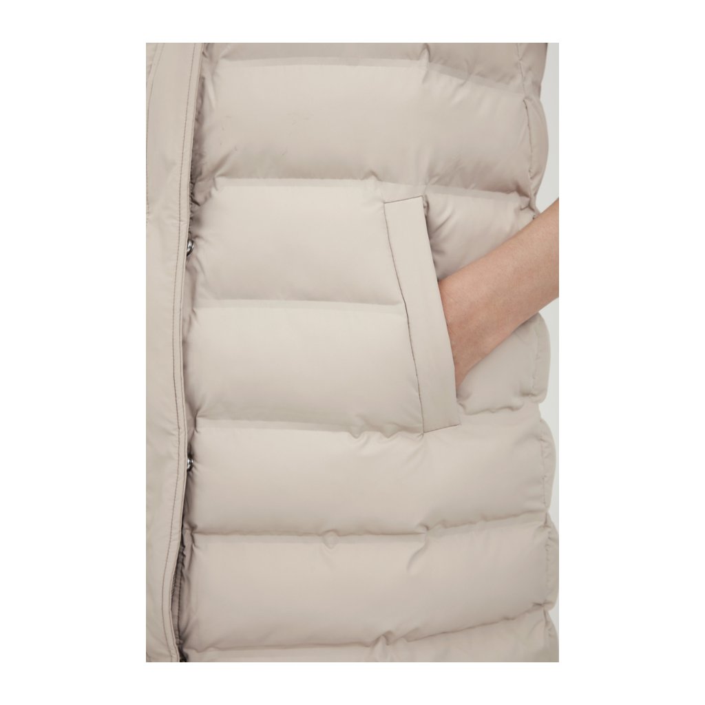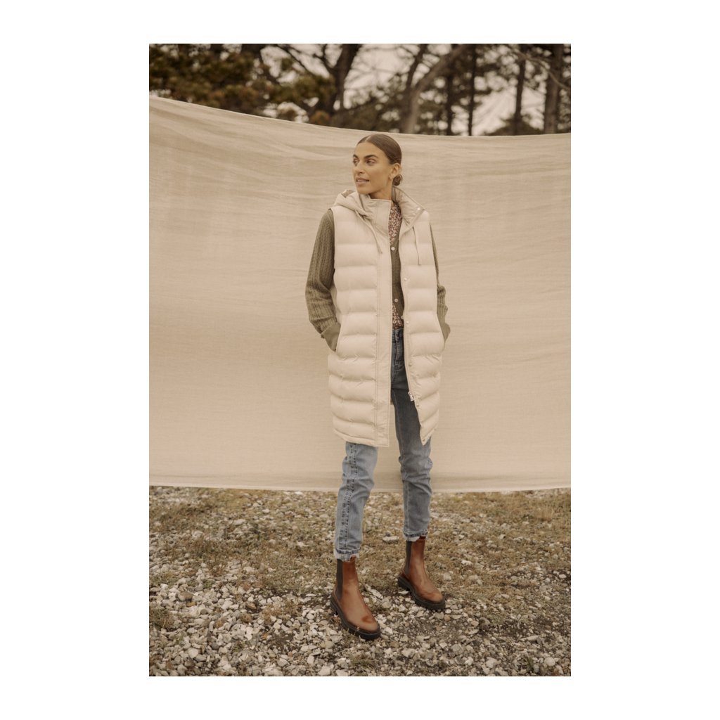Hřejivá vesta s kapucí a kapsami. Kapuci lze stáhnout pomocí šňůrek a odepnout pomocí zipu. Zapínání vesty na zip a cvoky.