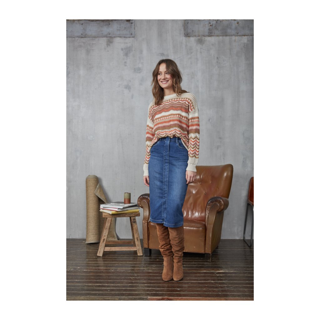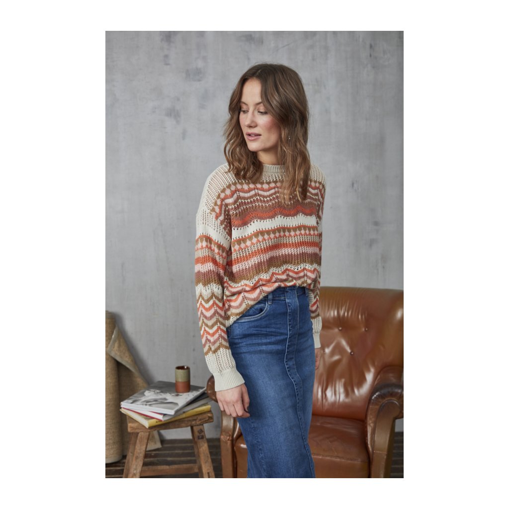 Svetr v příjemně tlumených tónech s dlouhým rukávem.