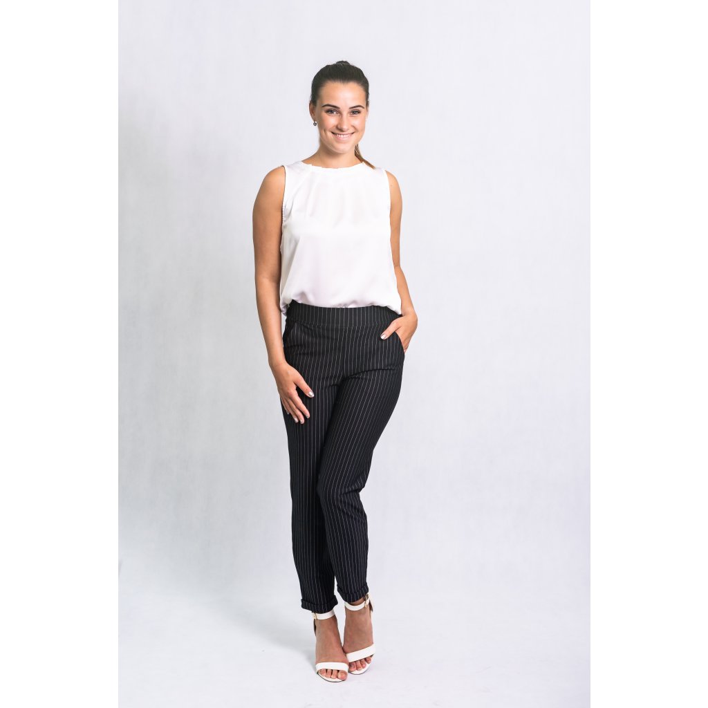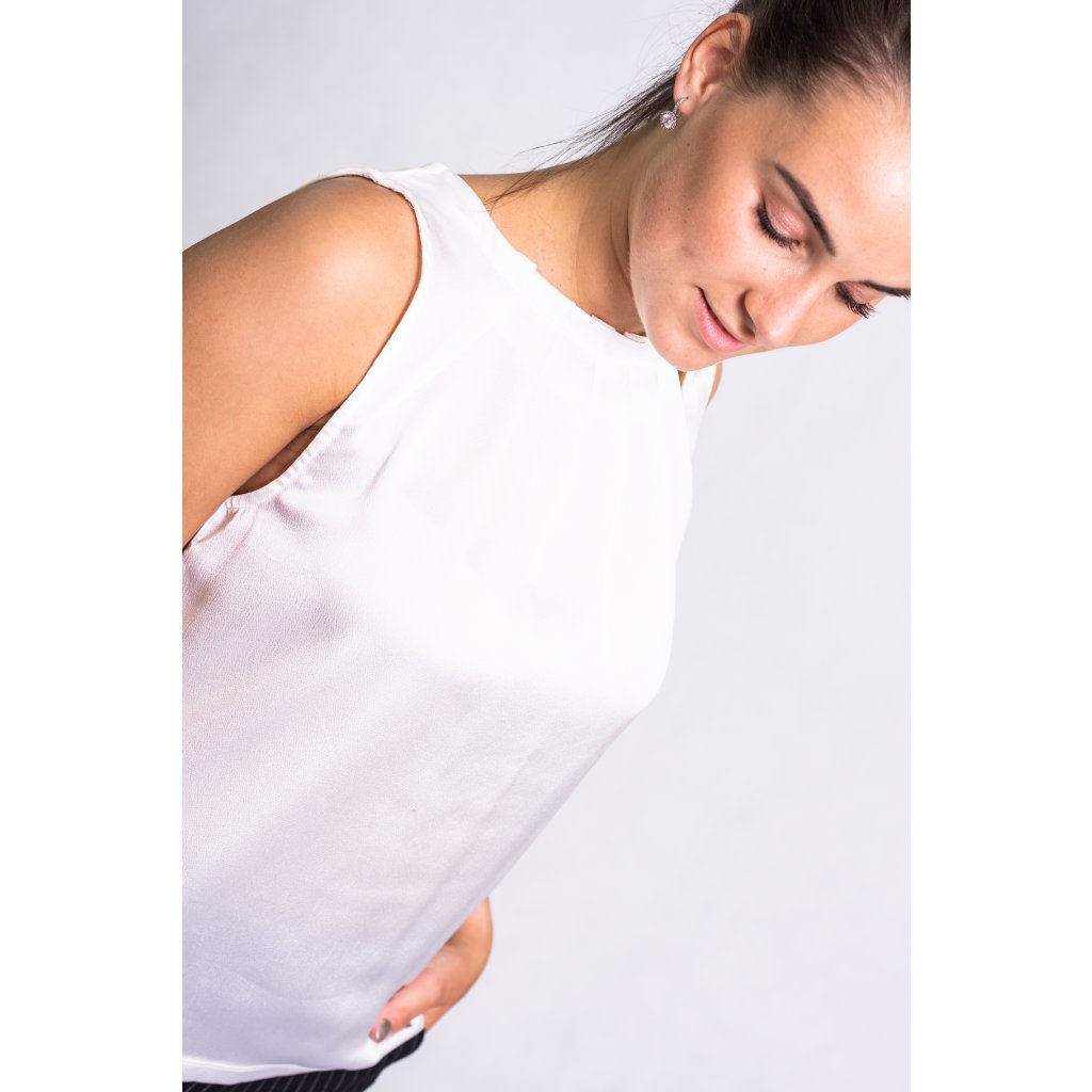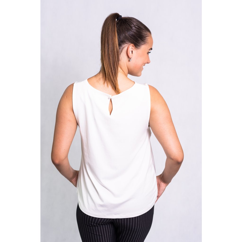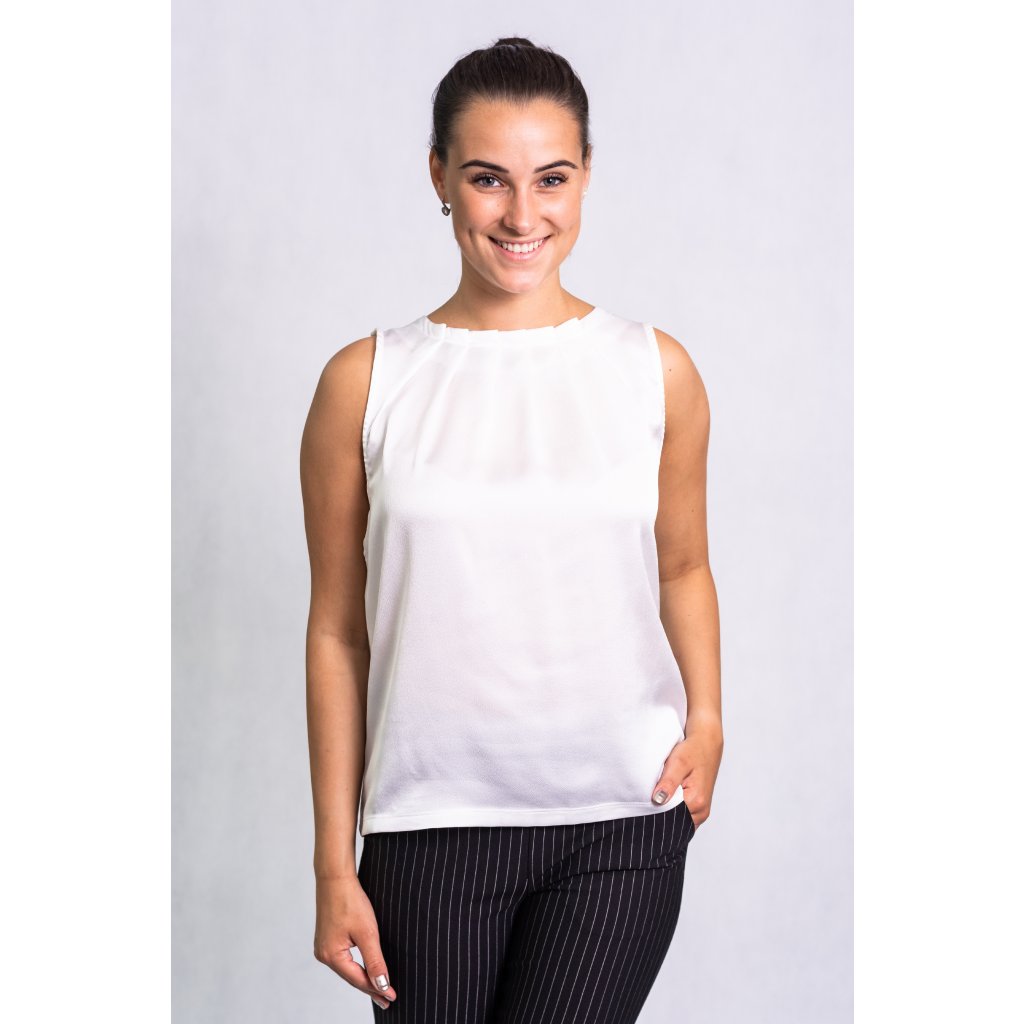 Elegantní halenka bez rukávů, zapínání za krkem na knoflíček.
