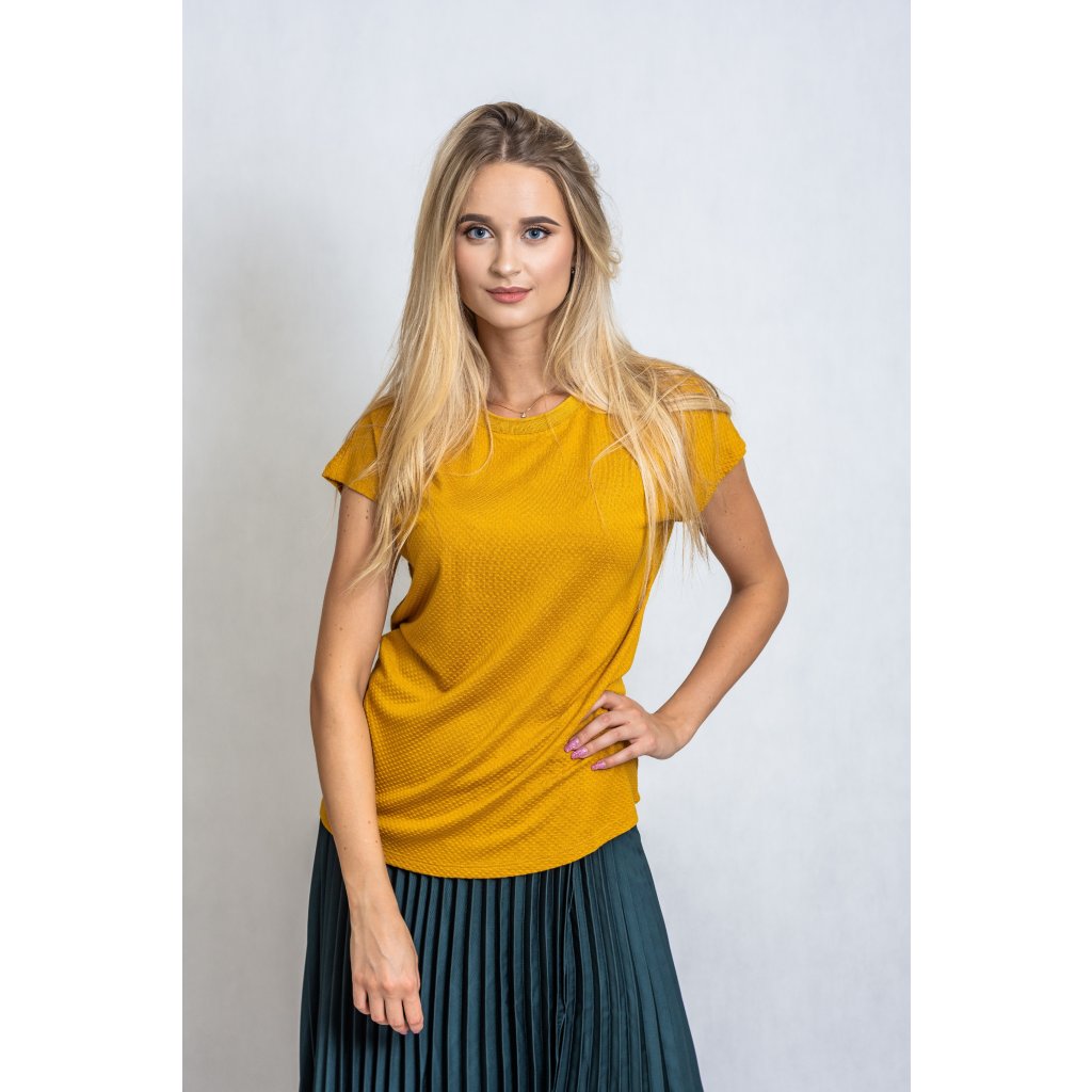 Halenka v trendy okrovém odstínu s krátkým rukávem.
