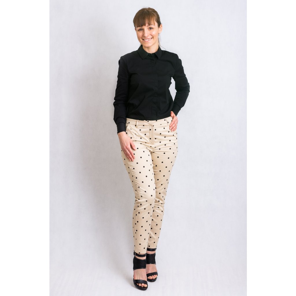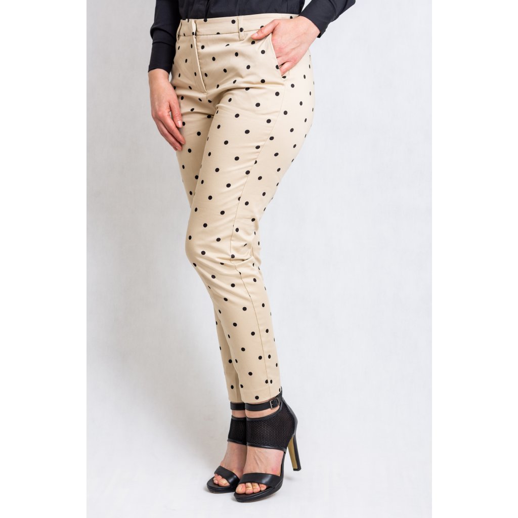 Krémové kalhoty s černými puntíky.