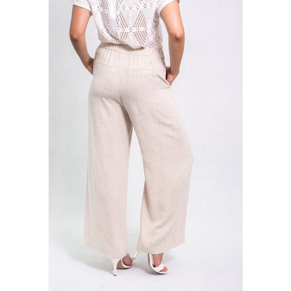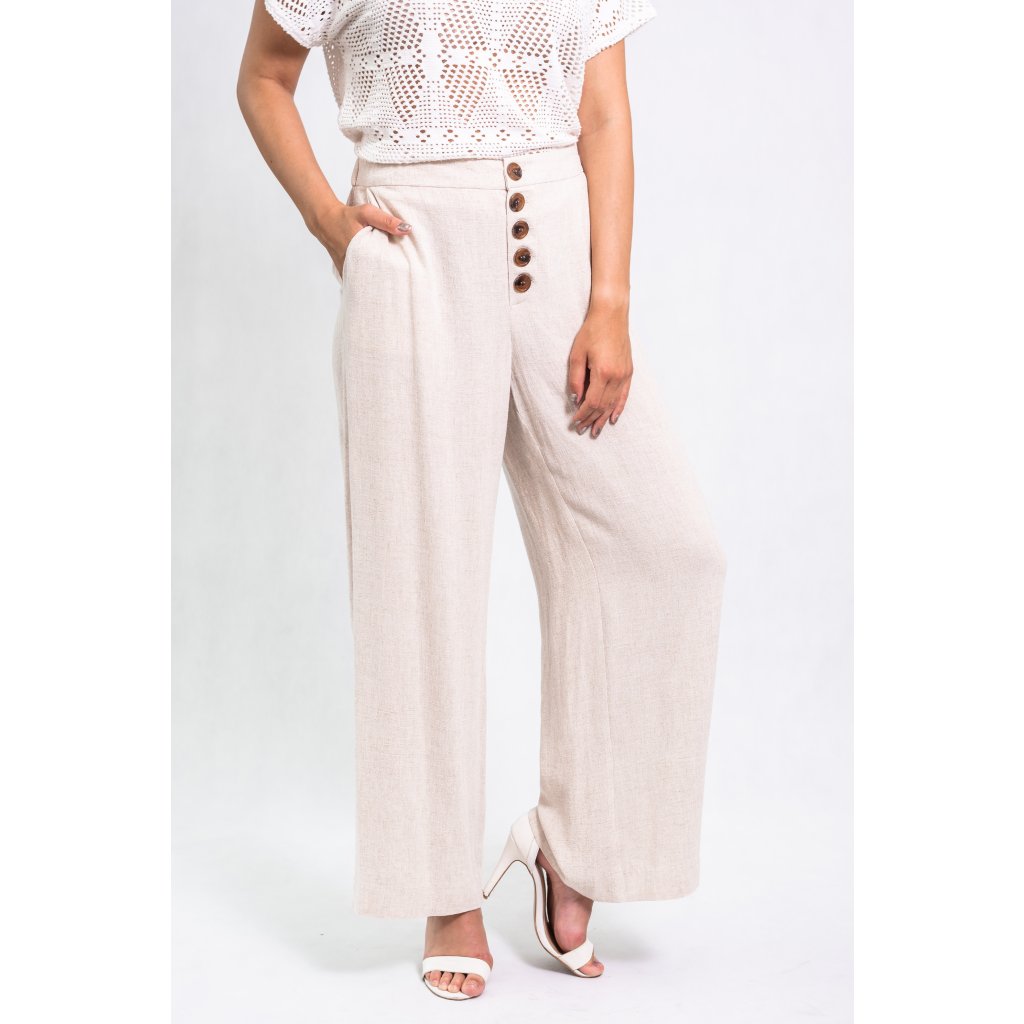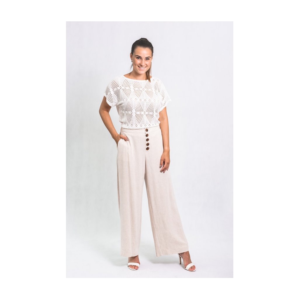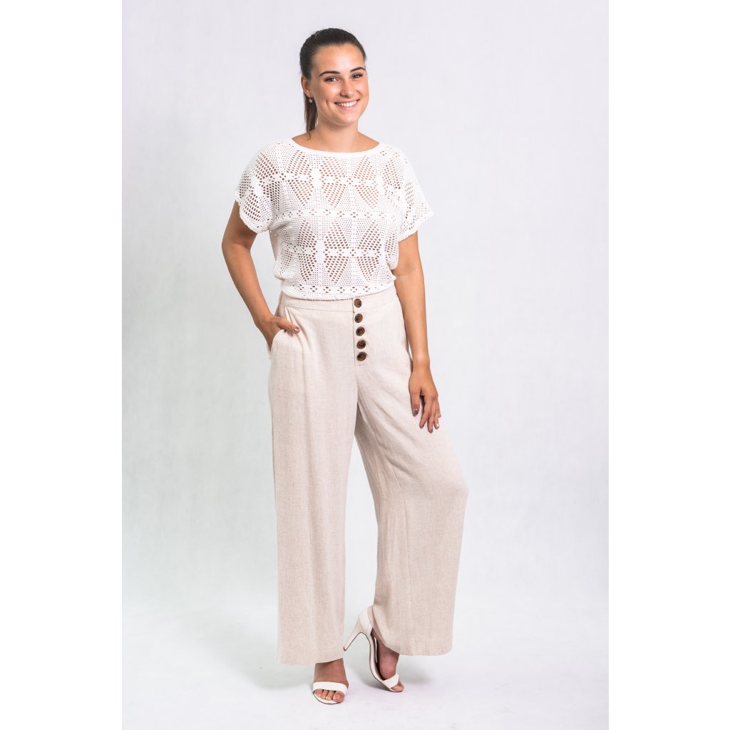 Lněné letní kalhoty s širokými nohavicemi. V zadní části pasu guma, ve předu zapínání pomocí knoflíků.