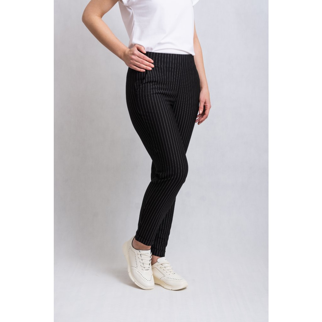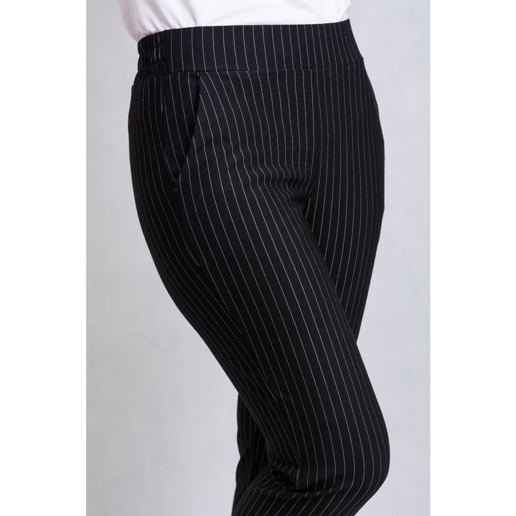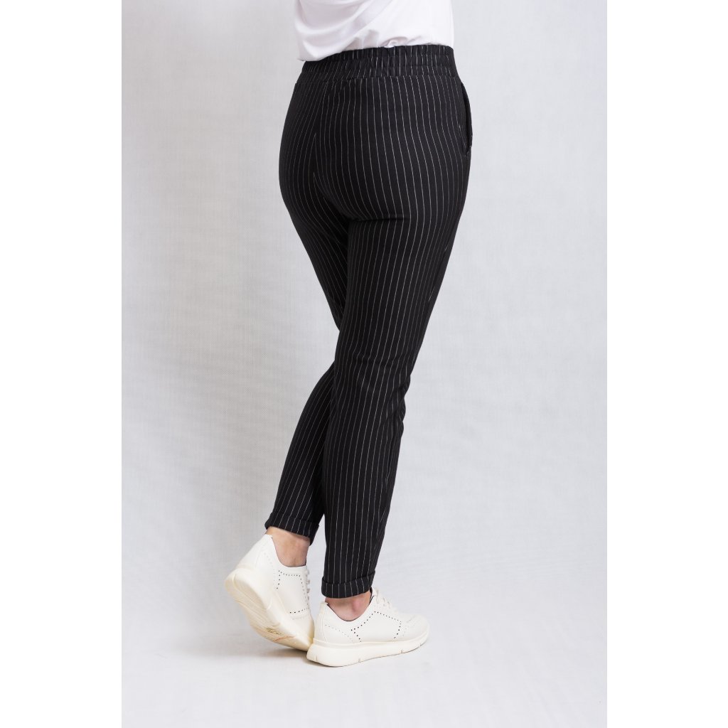 Černé kalhoty s jemným bílým proužkem, pohodlné, v pase na gumu.