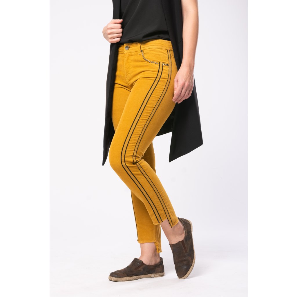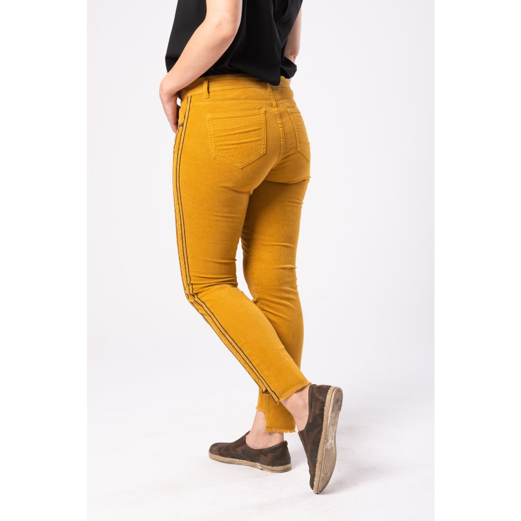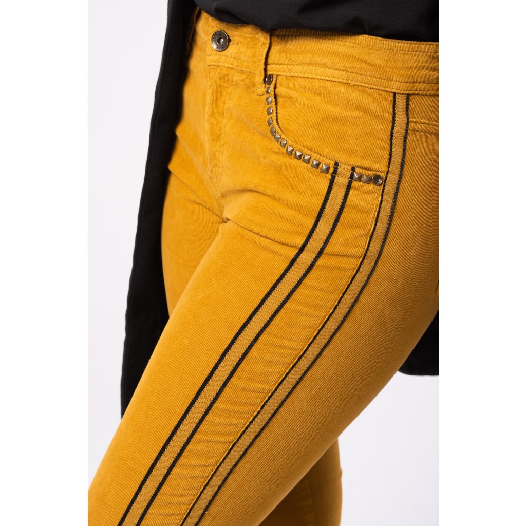 Padnoucí manšestrové kalhoty v trendy podzimní barvě, kovanými aplikacemi kolem kapes a střiženými nohavicemi. Zapínání zip + knoflík.