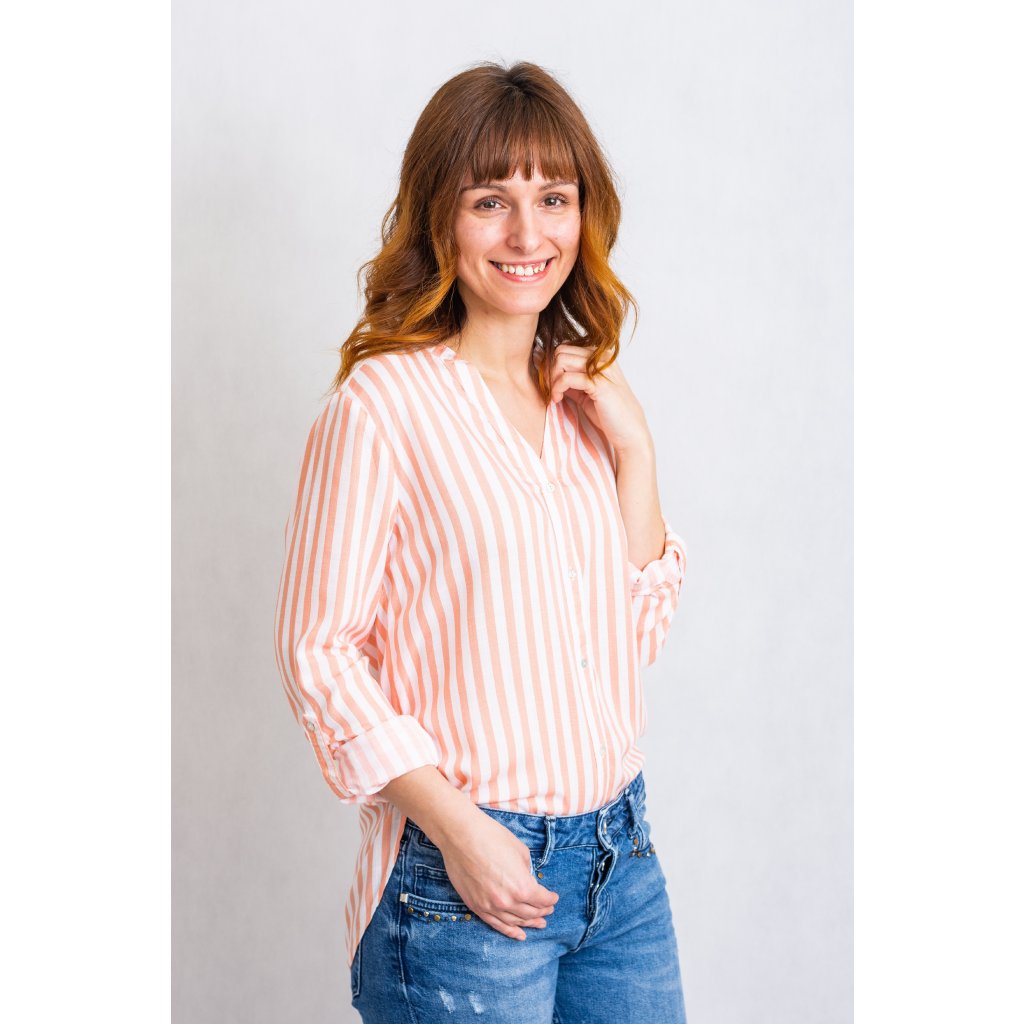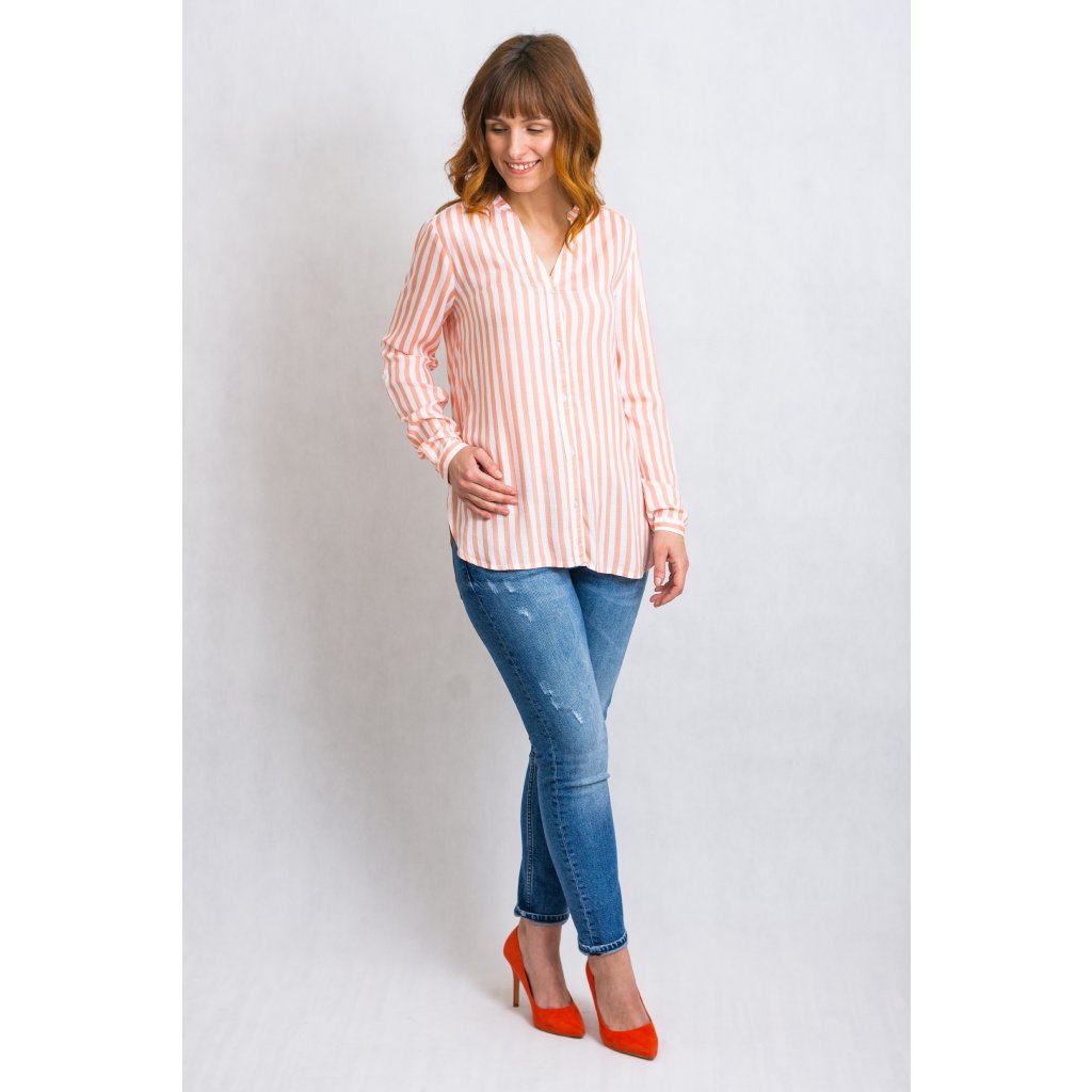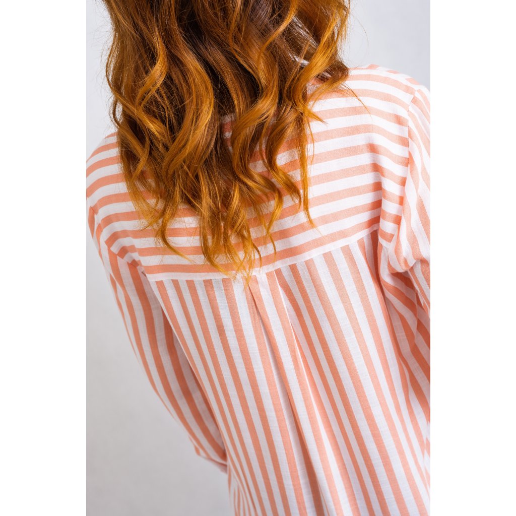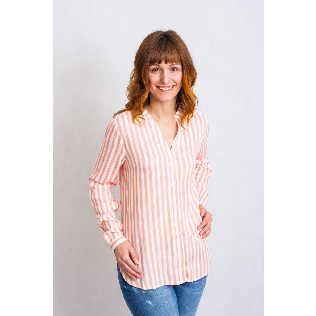 Košile volného střihu s proužky. Zapínání na knoflíky, rukávy možno nosit dlouhé nebo ohrnout a připnout knoflíčkem.