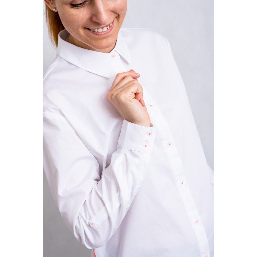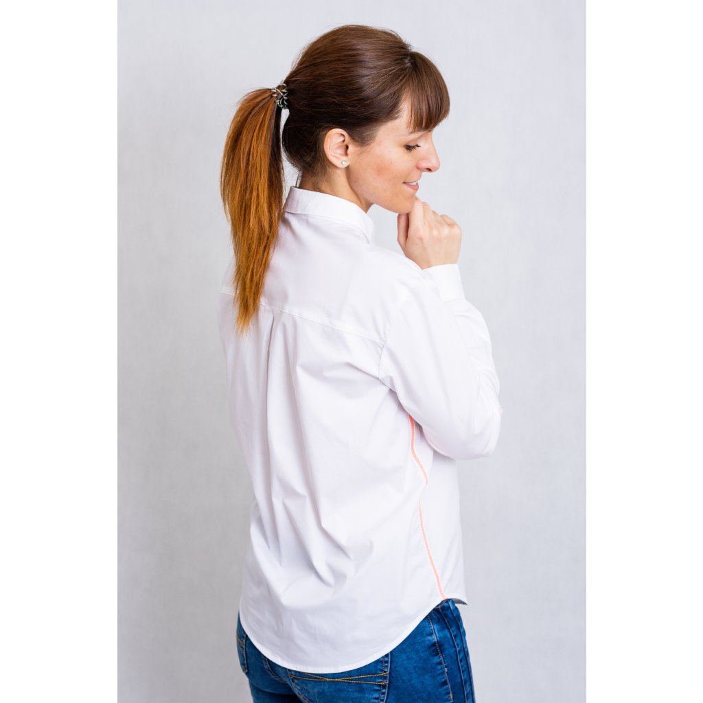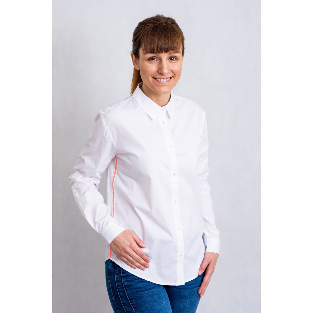 Dámská košile volného střihu s dlouhým rukávem, zdobená fosforově růžovým proužkem.