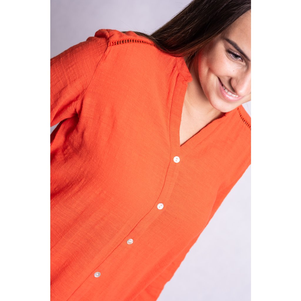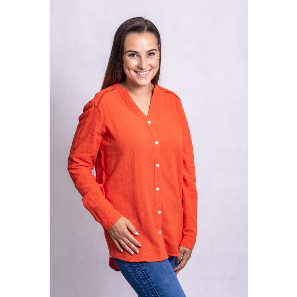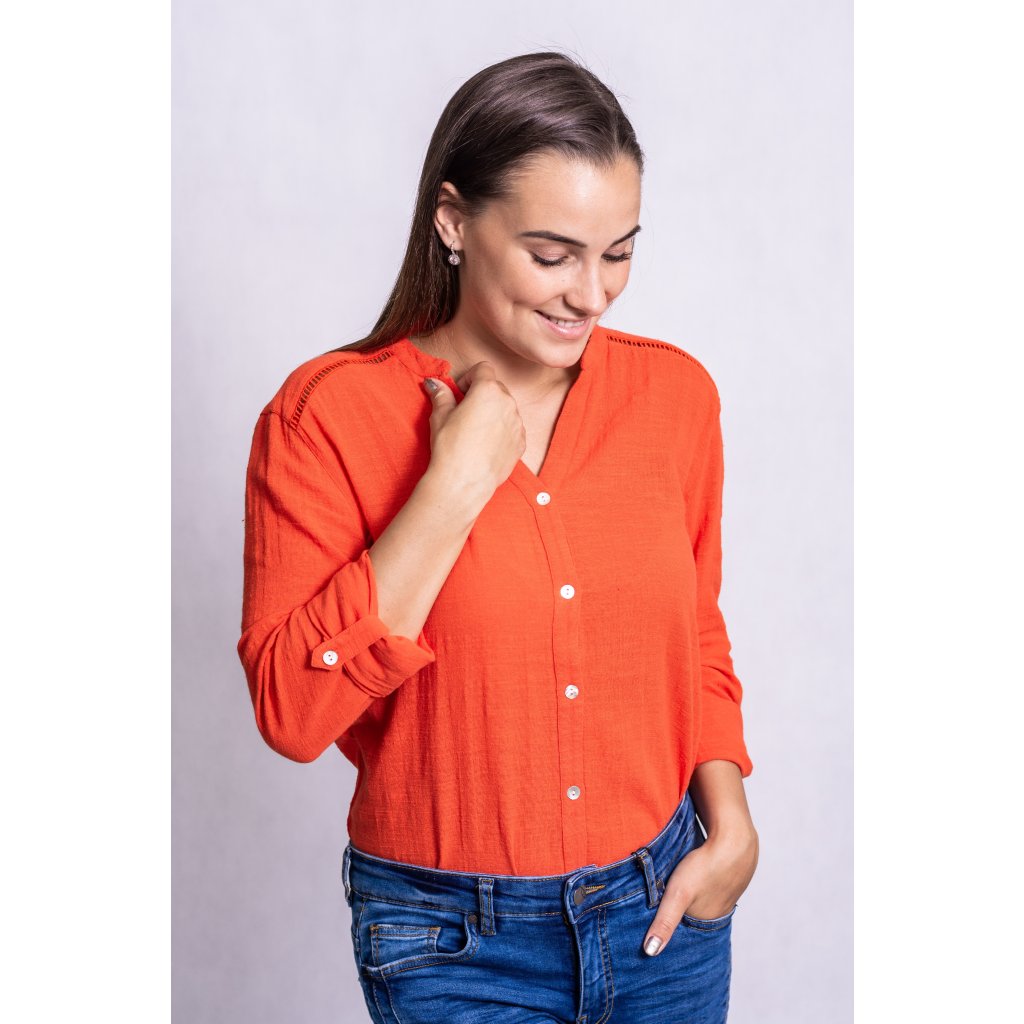 Lněná košile volného střihu. Rukávy lze ohrnout a sepnout pomocí knoflíčků.