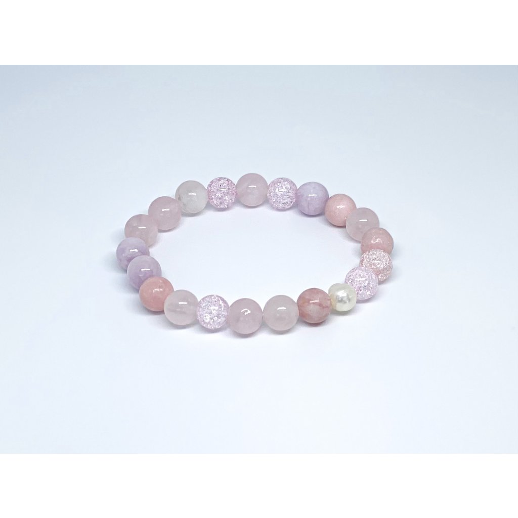 minerály: madagaskarský růženín (kvalita A), kunzit spodumen (kvalita A), perla, růžový opál, praskavý křišťál barevný