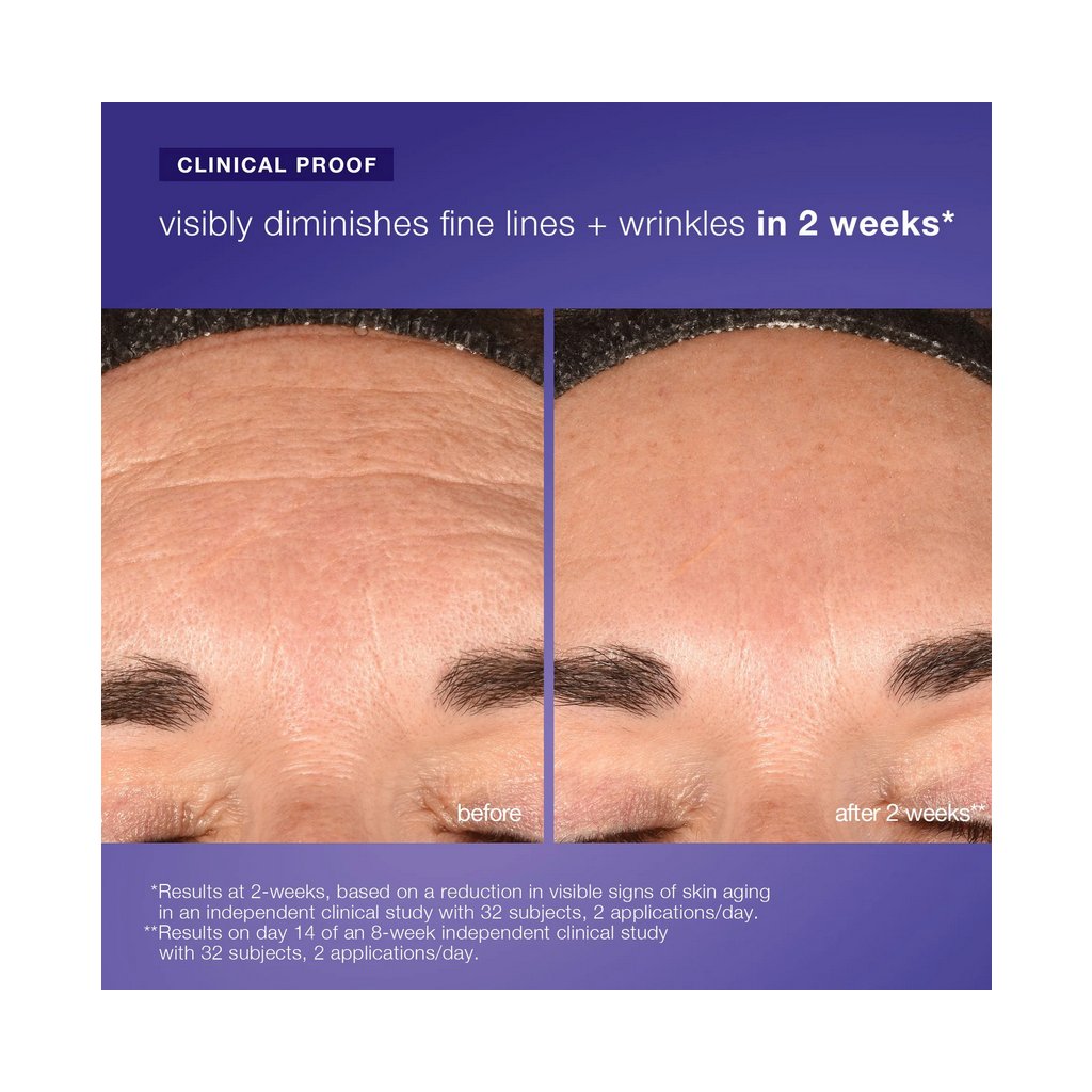 Ve srovnání s neošetřenou pletí. Na základě in vitro testování. Výsledky po 2 týdnech, založené na snížení viditelných známek stárnutí pleti v nezávislé klinické studii s 32 účastníky, při aplikaci 2× denně.