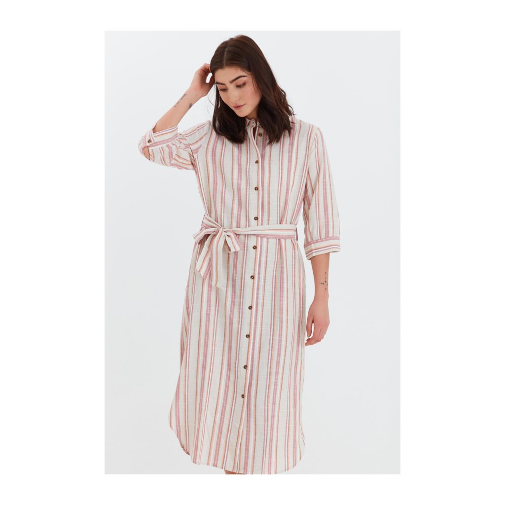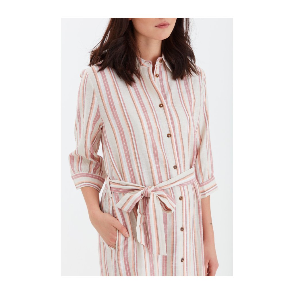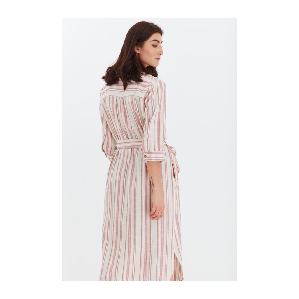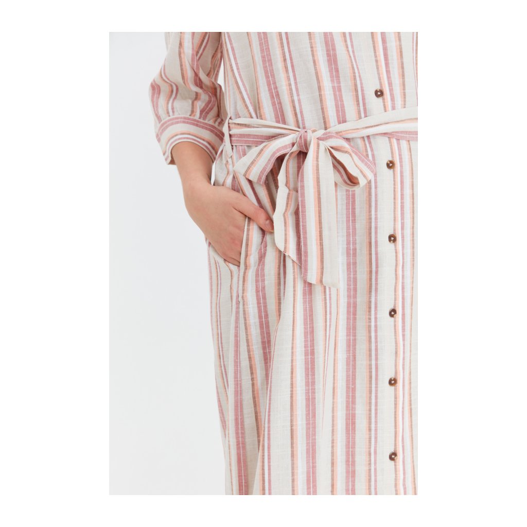 Lněné pruhované šaty košilového střihu s kapsami. Zapínání na knoflíky, součástí je i pásek.