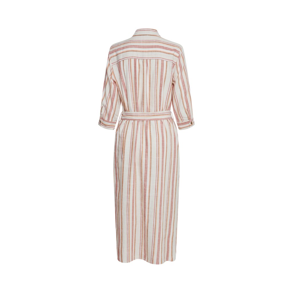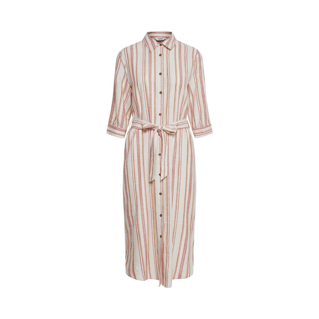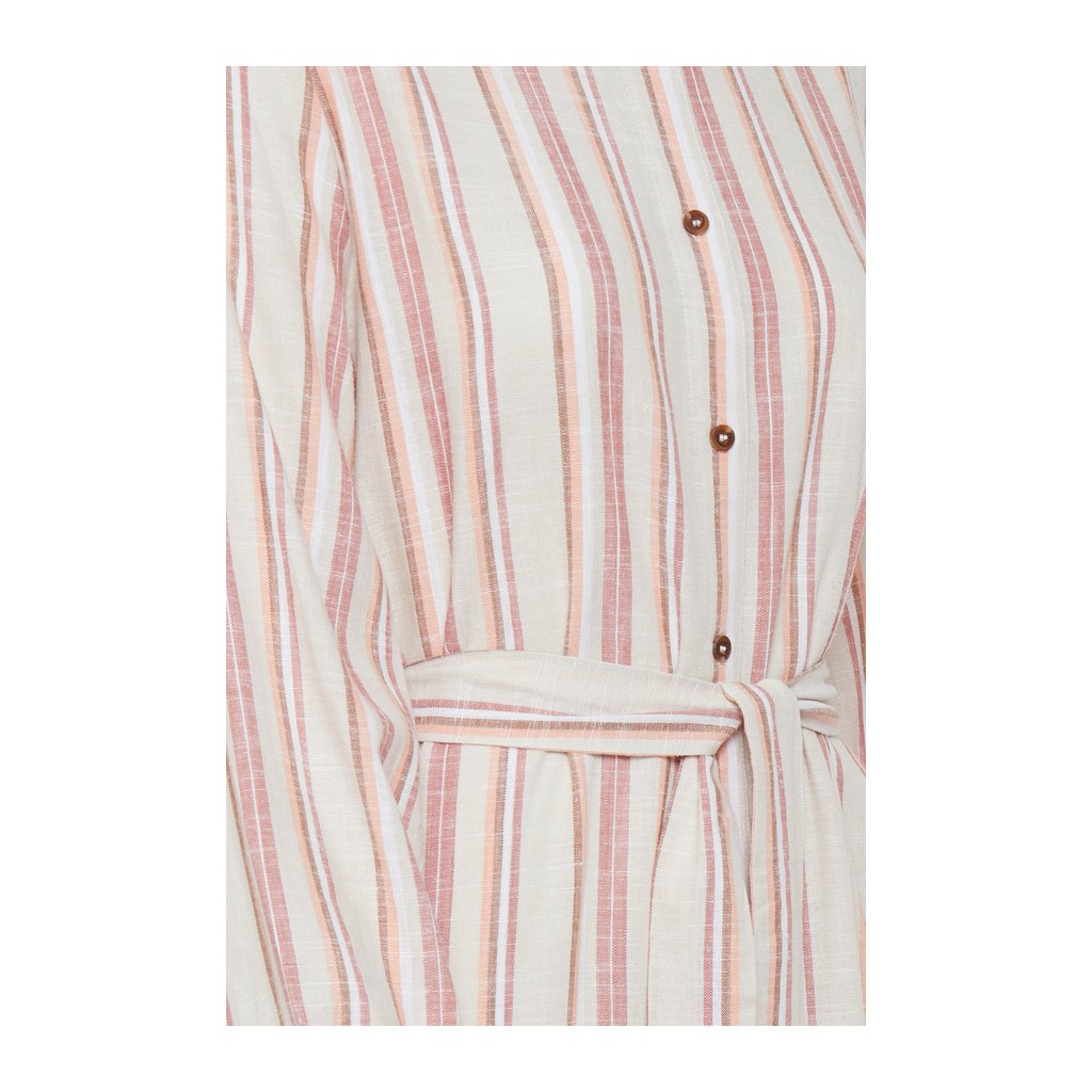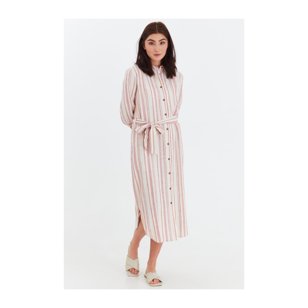 Lněné pruhované šaty košilového střihu s kapsami. Zapínání na knoflíky, součástí je i pásek.