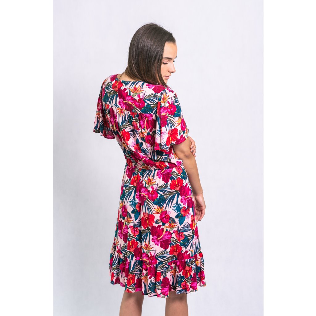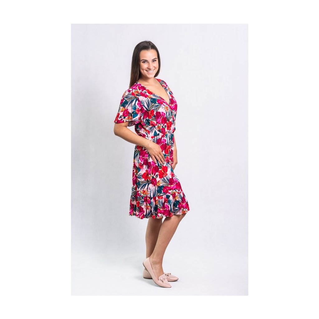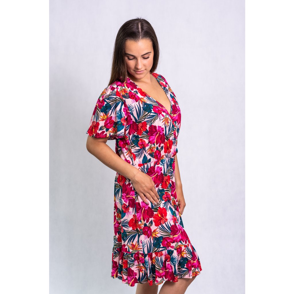 Letní květované šaty s krátkým rukávem, výstřihem do V, v pase na gumu a konec sukně je zdobený jemným volánkem.