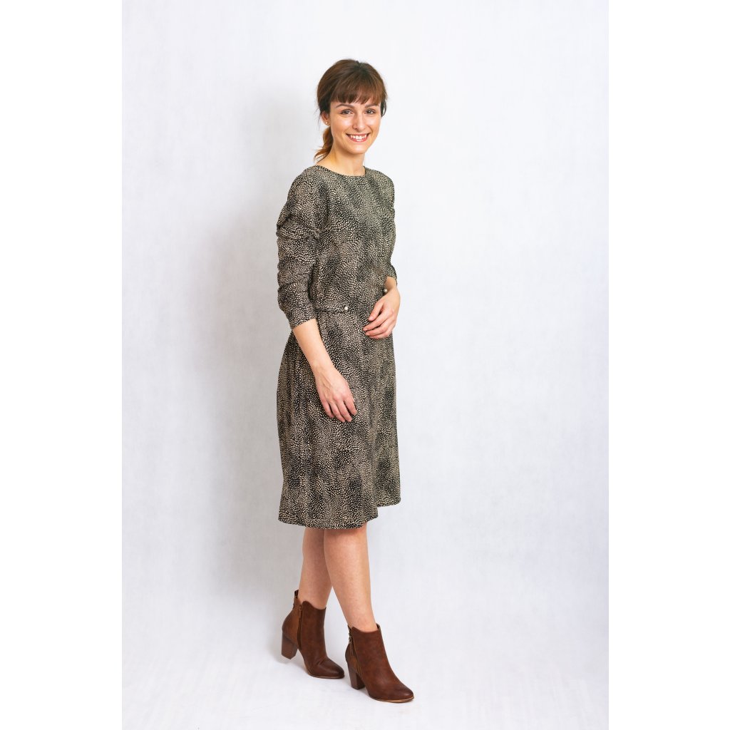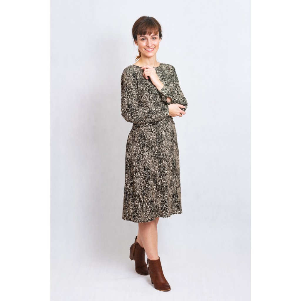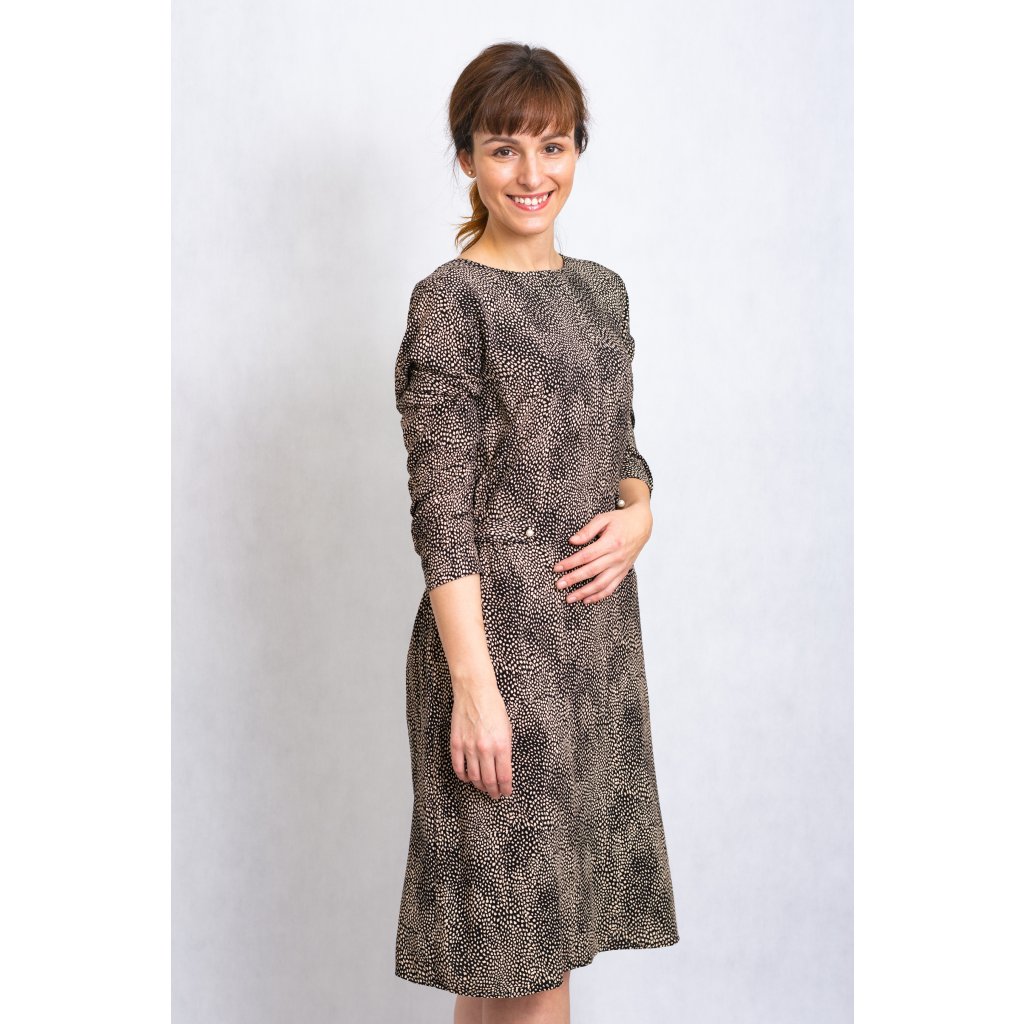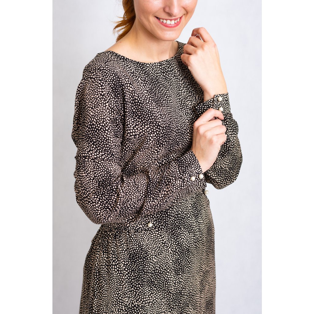 Vzorované šaty s podšívkou, dlouhým rukávem a zdobení manžet perličkou.
