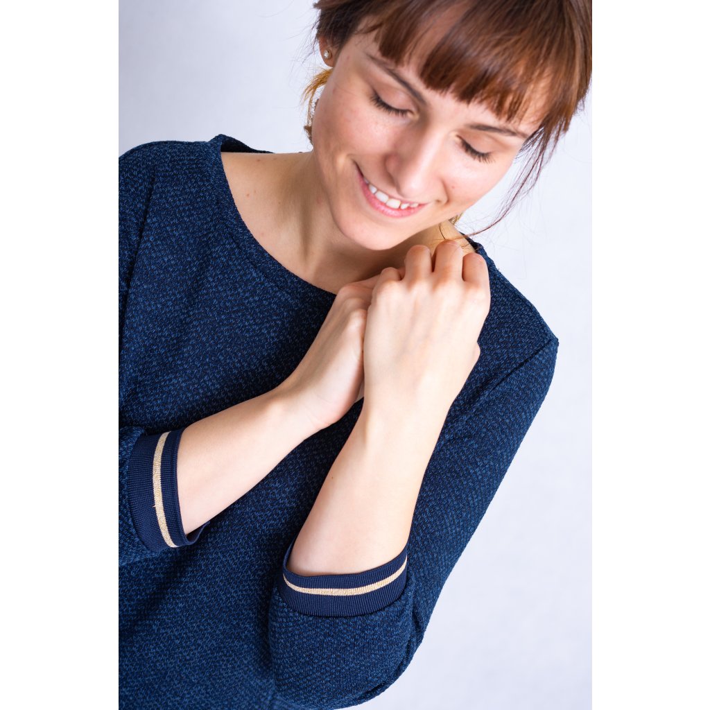 Tmavě modré volnočasové šaty s lemováním kolem kapes a rukávů.