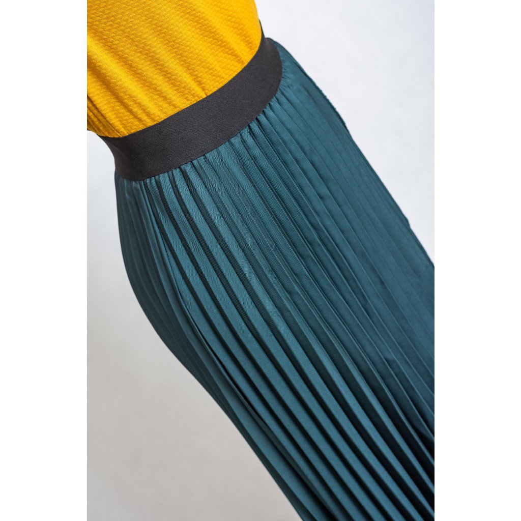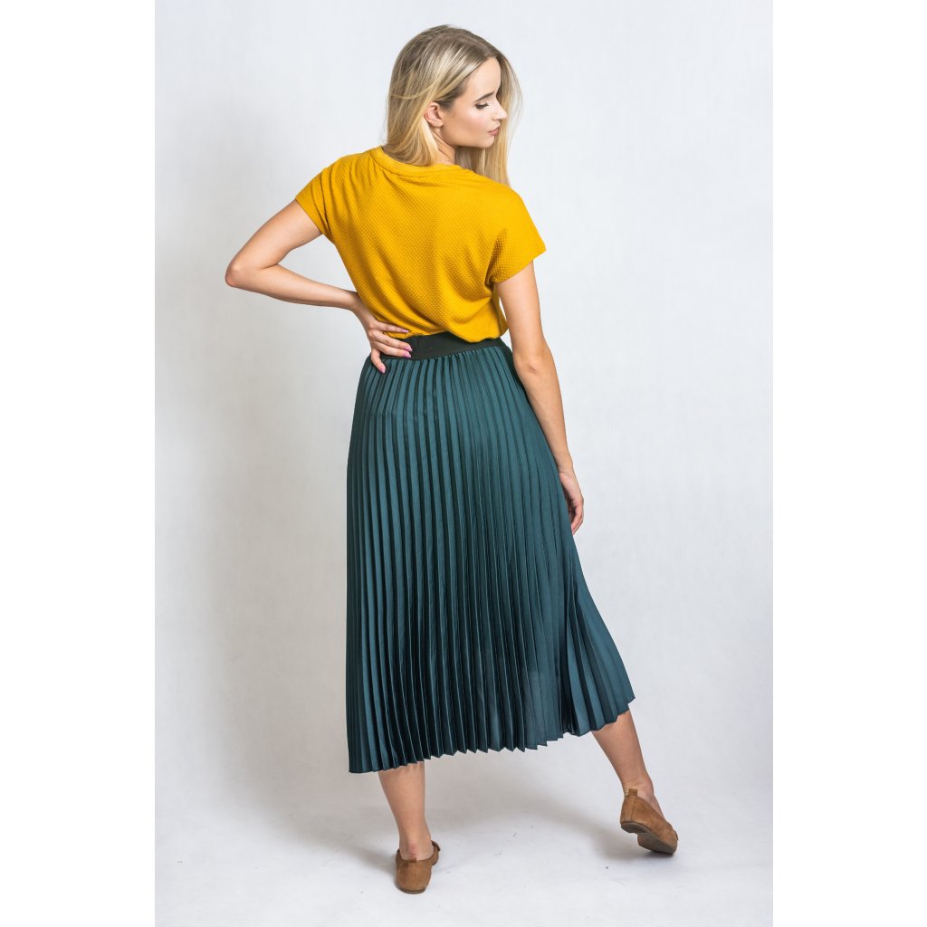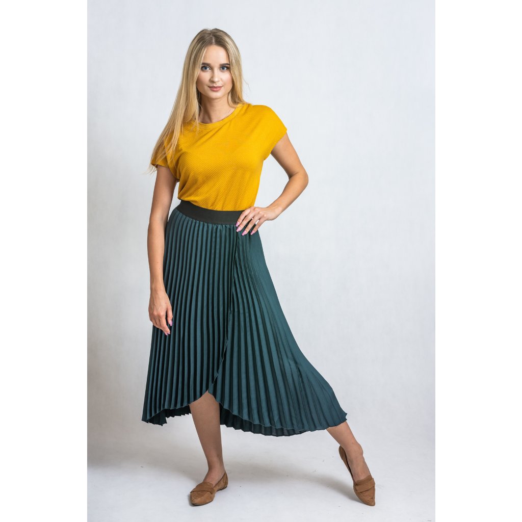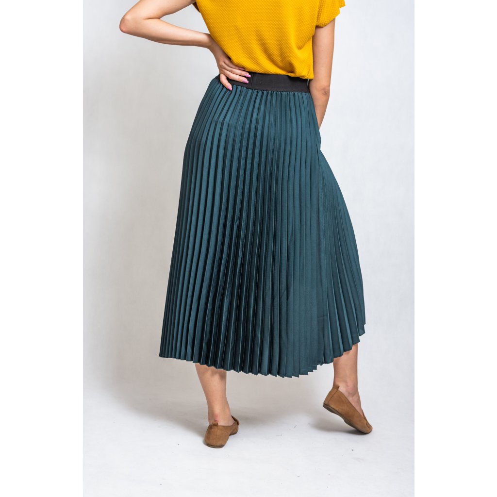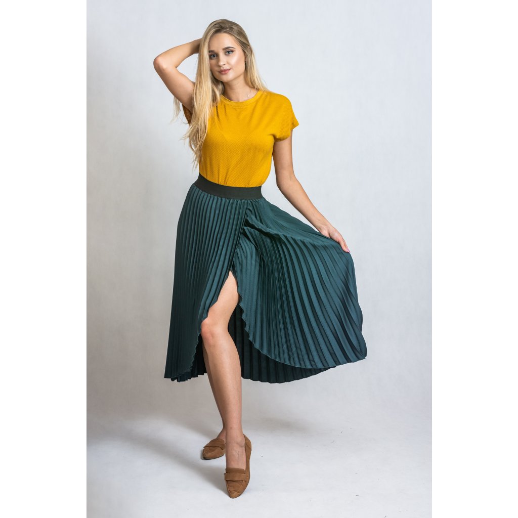 Plisovaná sukně s rafinovaným rozparkem, v pase na gumu.