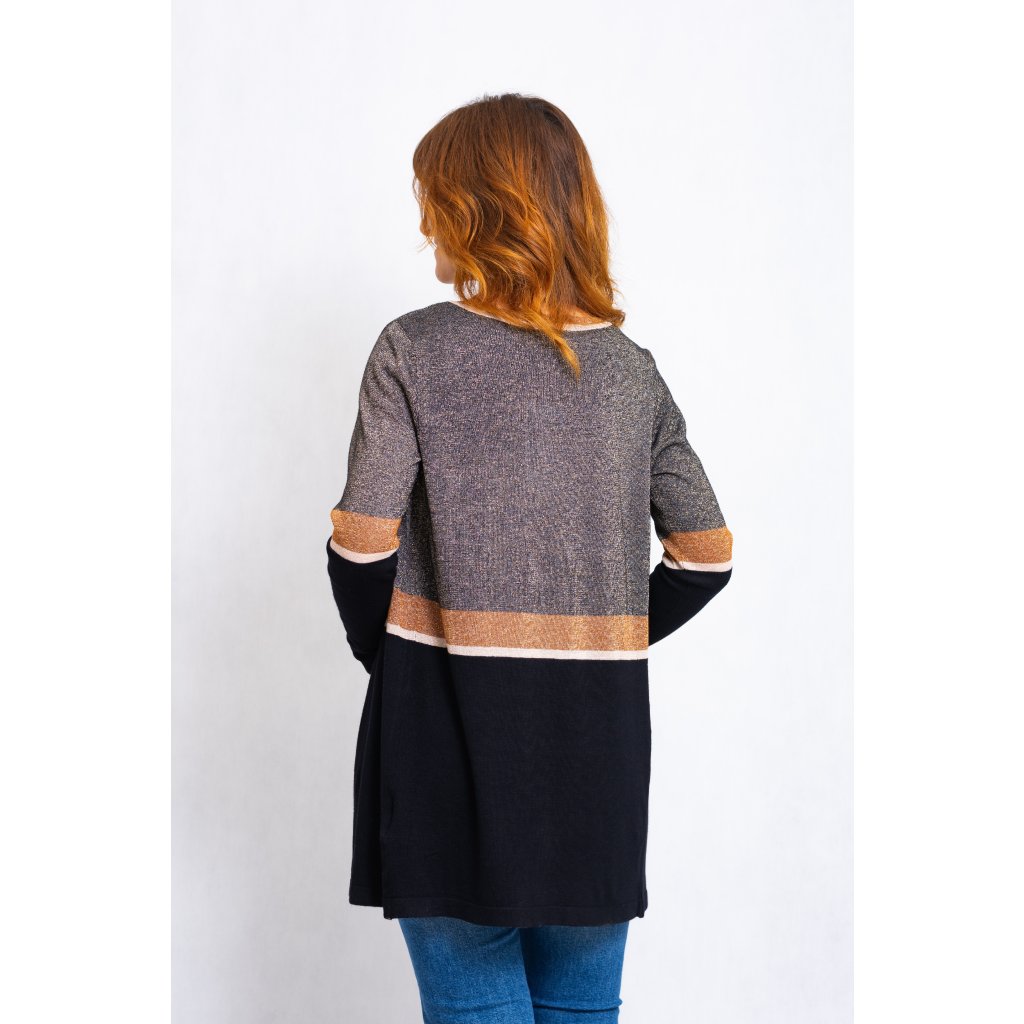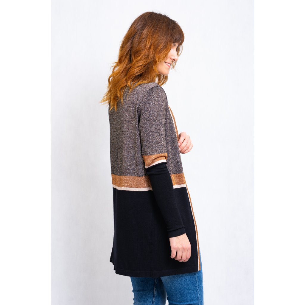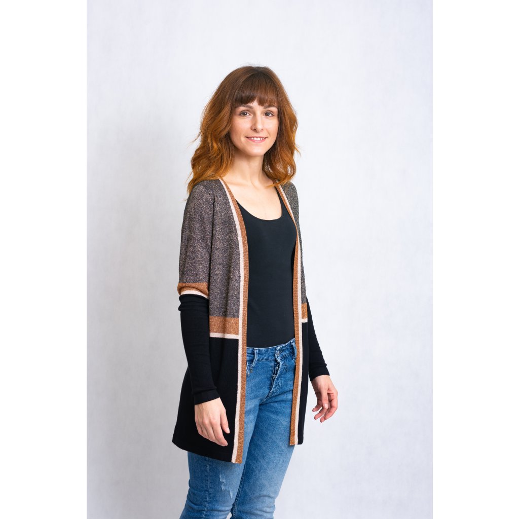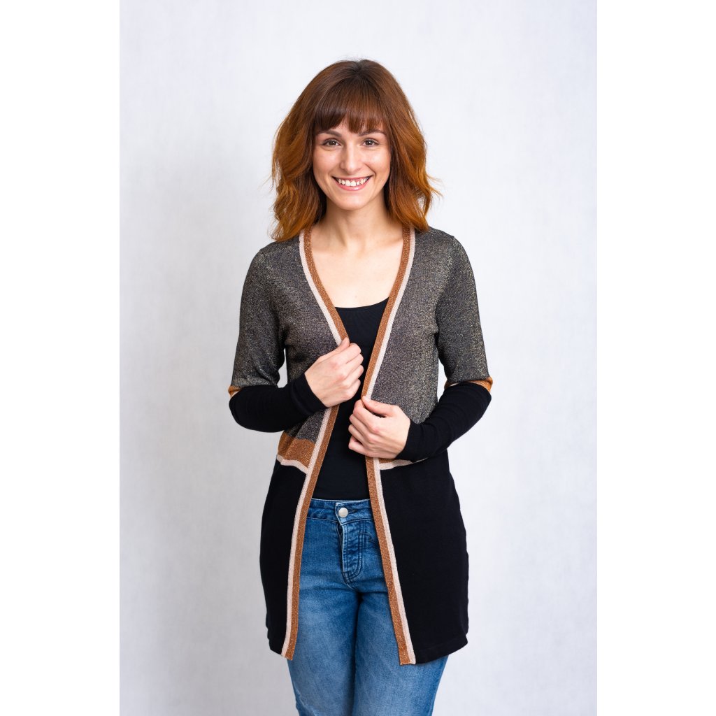 Cardigan, lehký svetřík bez zapínání, protkávaný zlatavou nití.