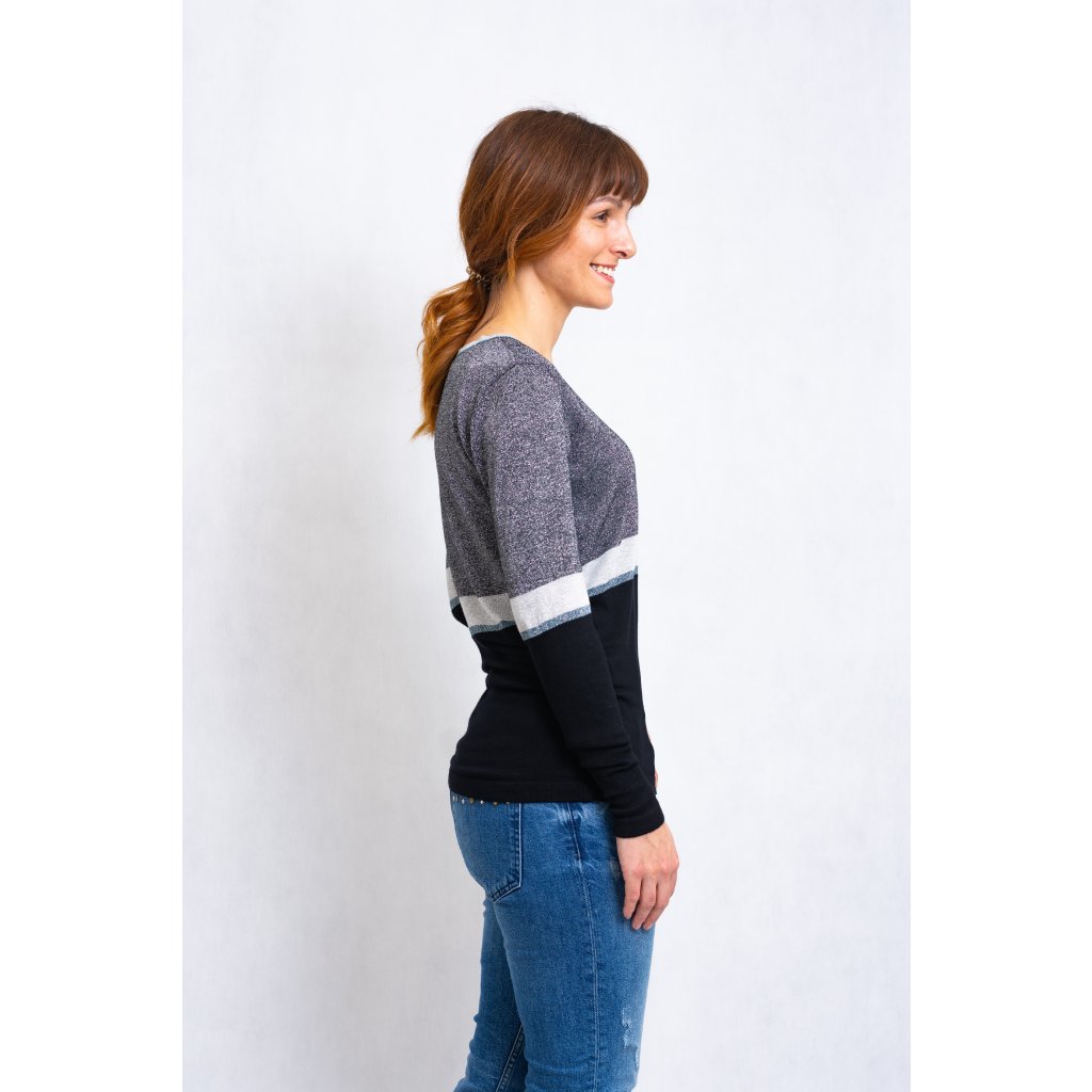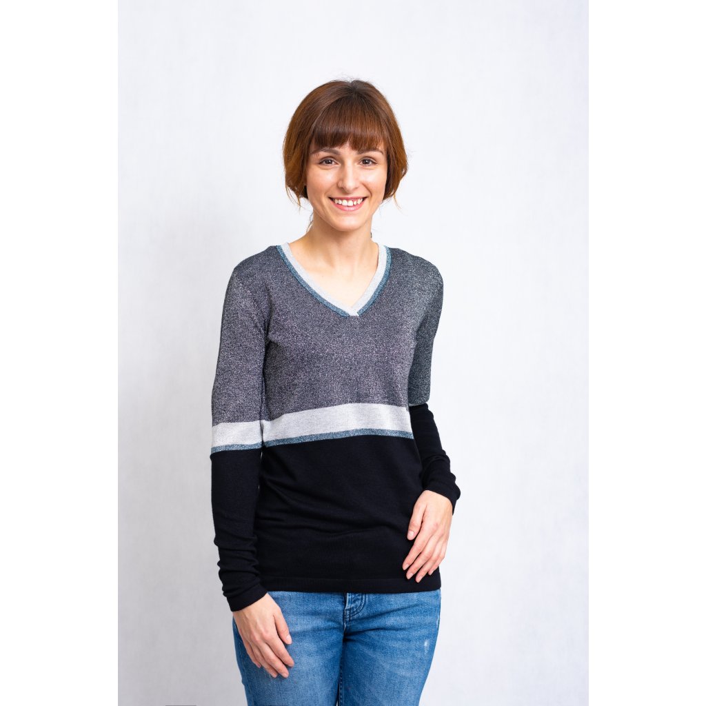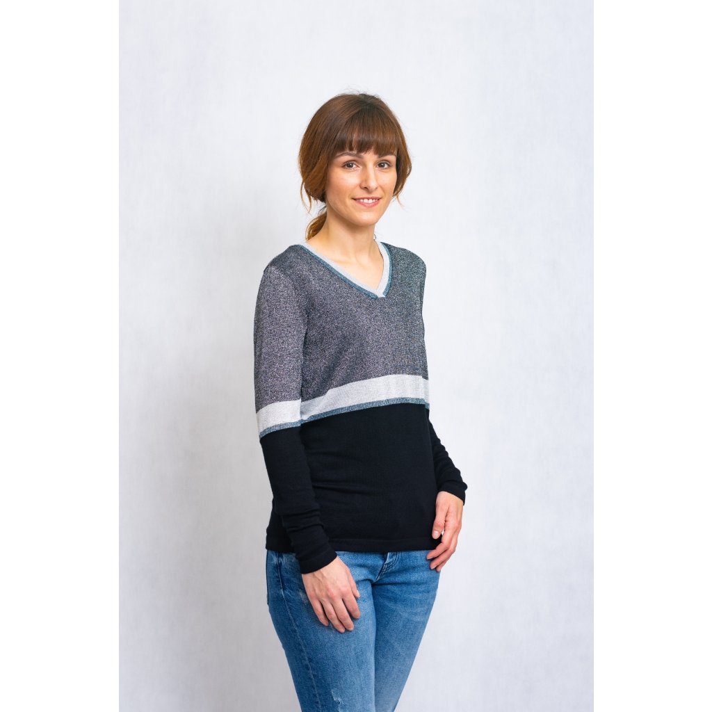 Delší svetřík s véčkovým výstřihem, protkávaný stříbrnou nití.