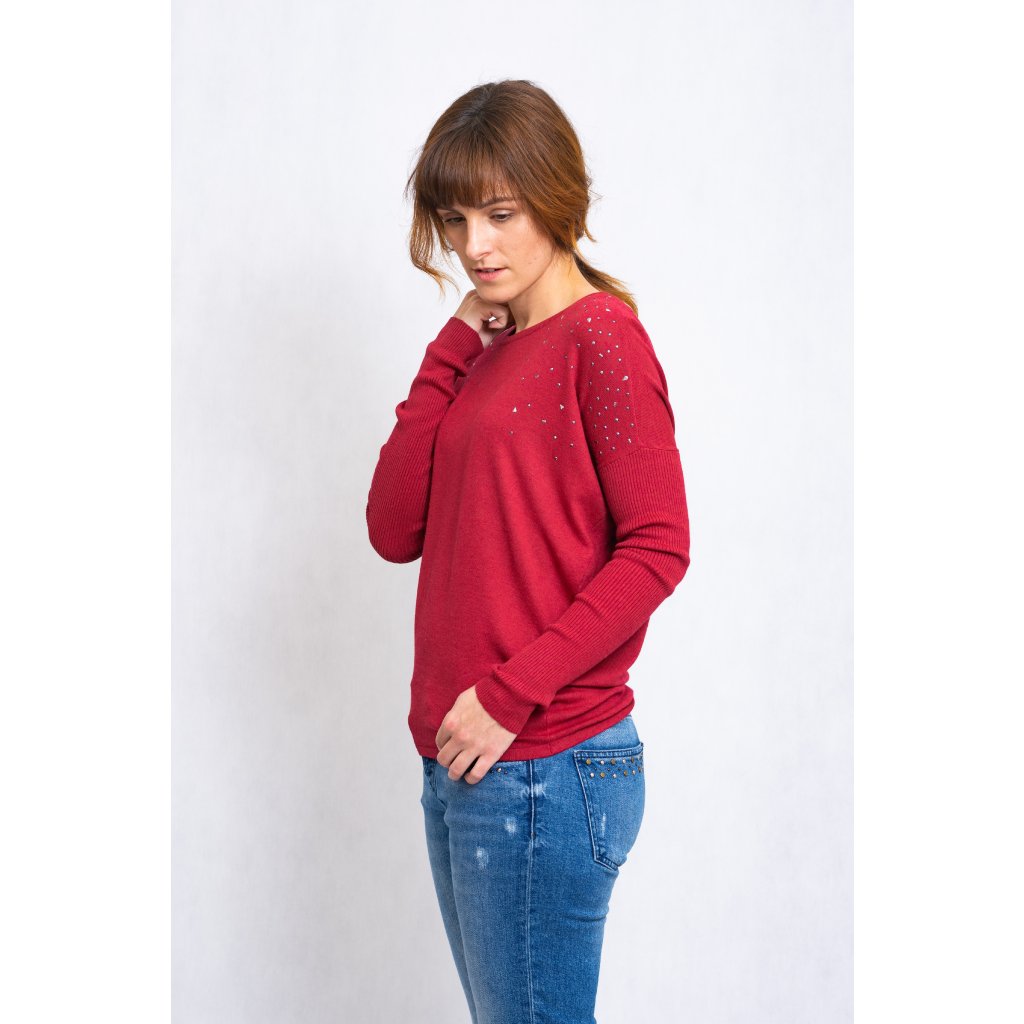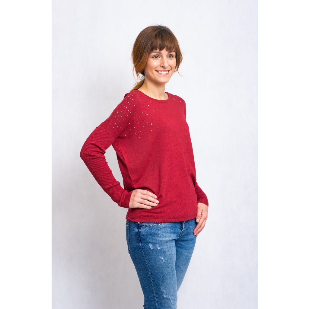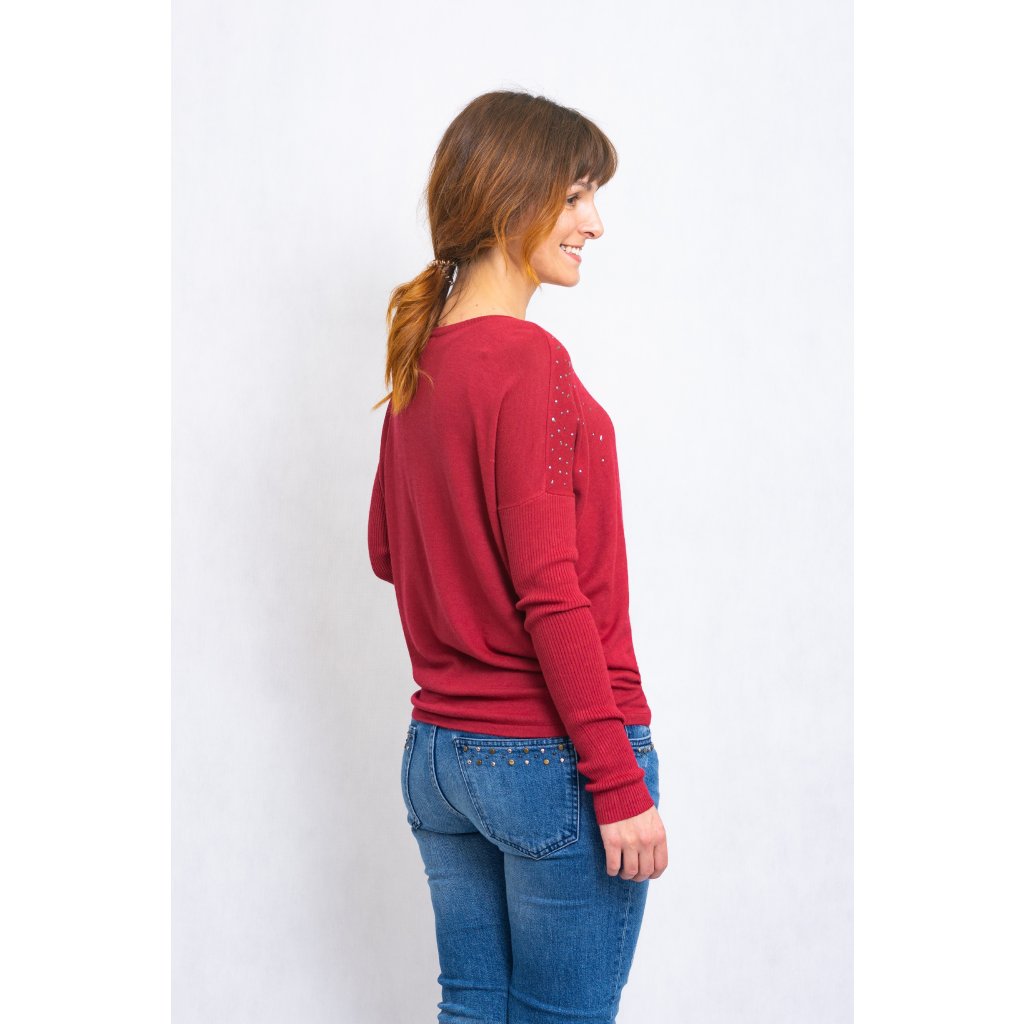 Červený svetr netopýřího střihu s kovovým zdobením na ramenou.