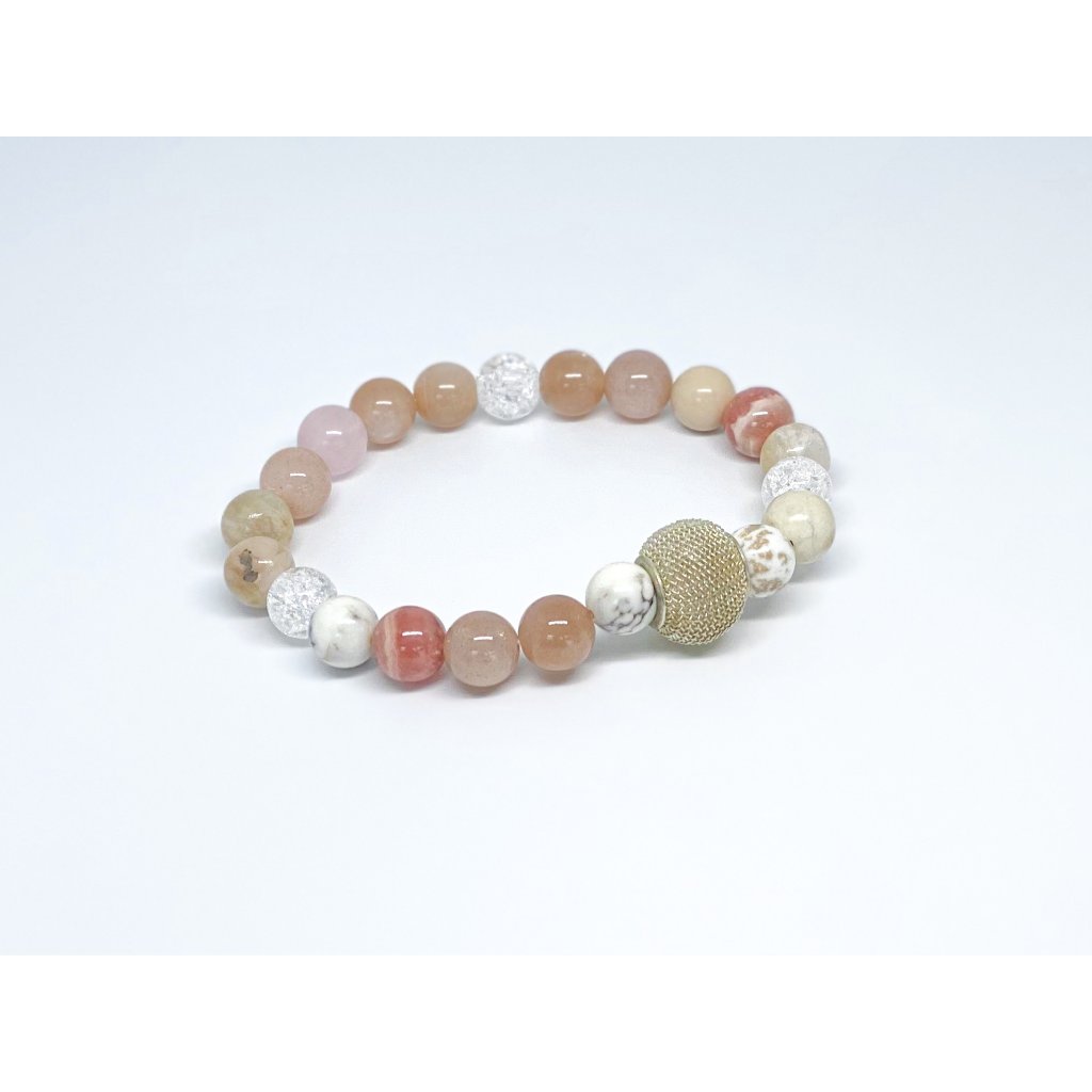 TOUCH OF ELEGANCE (dotek elegance) tvoří: síťovaný stříbrný korálek, broskvový měsíční kámen (kvalita AA), madagaskarský růženín (kvalita A), magnezit, argentinský rodochrozit, bambusový achát, mookait, sluneční kámen, praskavý křišťál